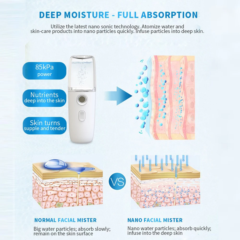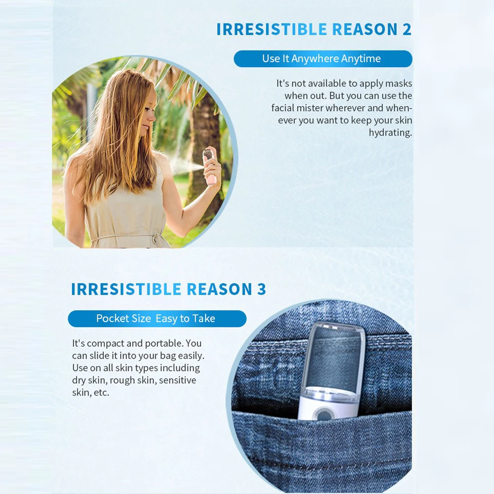 Хороший увлажняющий и освежающий мини-спрей для лица, 45s пополнение глубокой воды, мини устройство холодного тумана для лица использует нанотехнологии ультразвуковые изменения молекул воды с помощью ионного распыления тумана, кожа более легко впитывается, не оставляет капель. Увлажняет сухую кожу и дает идеальный спа-центр на кончиках пальцев, но не впитывается в лицо.