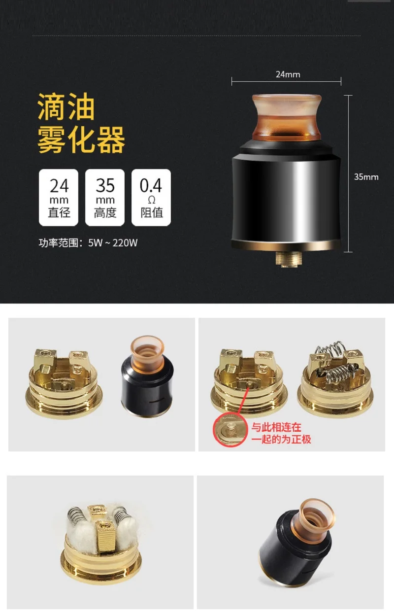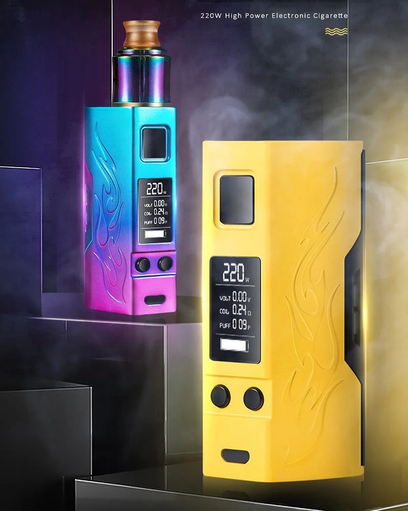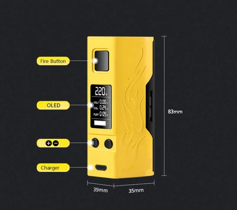 Максимальный выход 220 Вт Attractice узоры и легкий Высокоэффективные режимы VW/TC (NI/TI/SS) Высокотемпературная и защита от короткого замыкания Размер: 39x35x83 мм Диапазон мощности: 5-220 Вт Диапазон температур: 100 °C-315 °C/200 °F-600 °F Режимы работы: VW/NI/TI/SS Диапазон сопротивления: 0,05-3,5 Ом Батарея: 2x18650 батареи (не входят в комплект) Материал: Поликарбонат: 510 нить