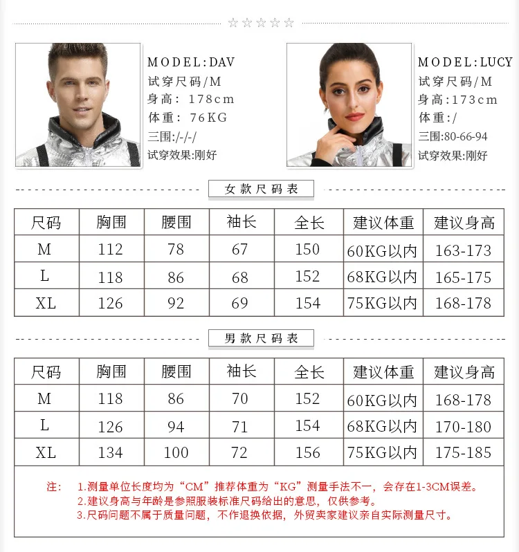 Включает: только один комбинезон. Размер женской модели: обхват груди: 80 см, обхват талии: 66 см, обхват бедер: 94 см, рост-173 см, примерьте размер M. Для женщин Размеры: M-обхват груди: 112 см, обхват талии: 78 см, длина комбинезона: 150 см, рост посадки: 163-173 см. L-обхват груди: 118 см, обхват талии: 86 см, длина комбинезона: 152 см, Высота посадки: 165-175 см. XL-обхват груди: 126 см, обхват талии: 92 см, длина комбинезона: 154 см, рост посадки: 168-178 см. Мужской размер модели: рост-178, Вес: 76 кг, см, примерьте размер «M». Для мужчин Размеры: M-обхват груди: 118 см, обхват талии: 86 см, длина комбинезона: 152 см, рост посадки: 168-178 см. L-обхват груди: 126 см, обхват талии: 94 см, длина комбинезона: 154 см, Высота посадки: 170-180 см. XL-обхват груди: 134 см, обхват талии: 100 см, длина комбинезона: 156 см, Высота посадки: 175-185 см.
