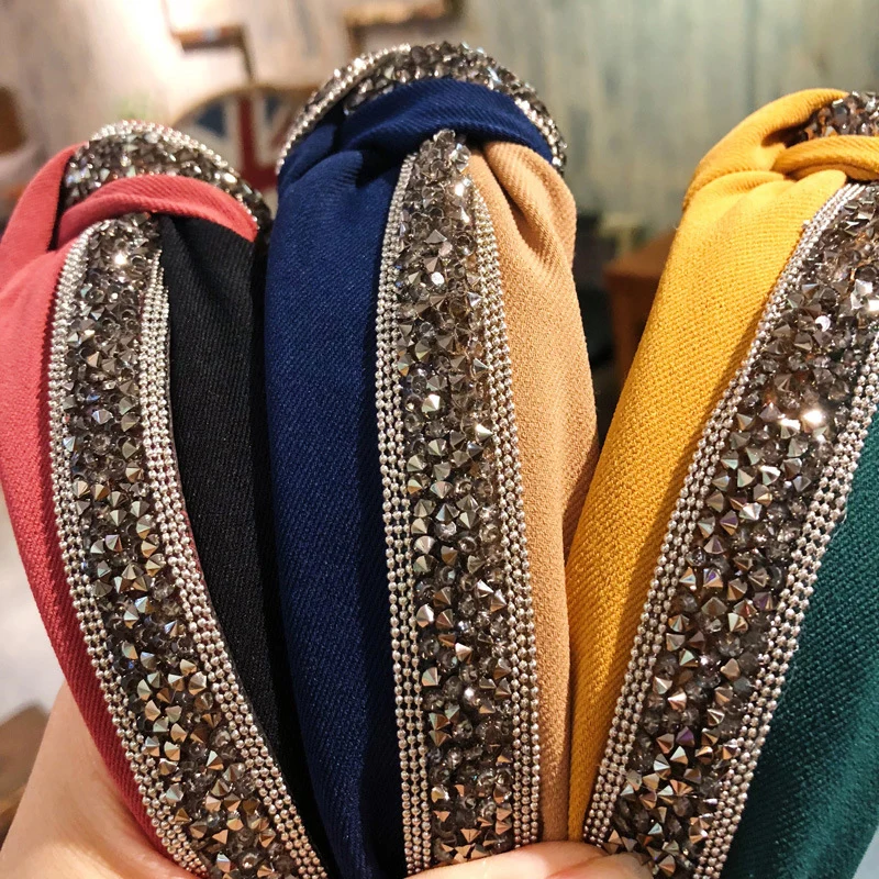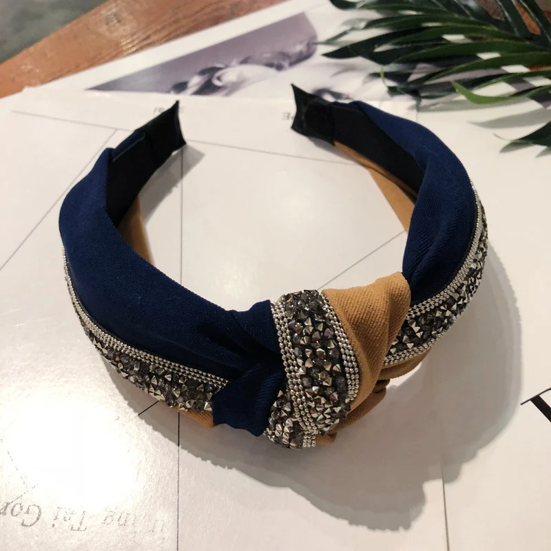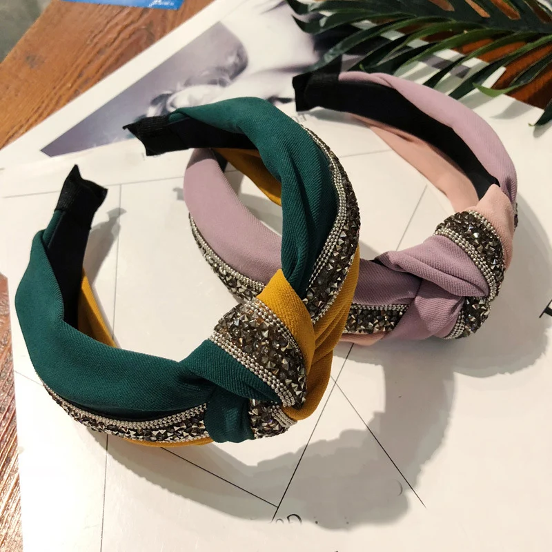 Широкий модный винтажный обруч для волос в стиле пэчворк с блестками, повязка на голову с бантом, женская блестящая повязка на голову с перекрещивающимися кристаллами и бантом