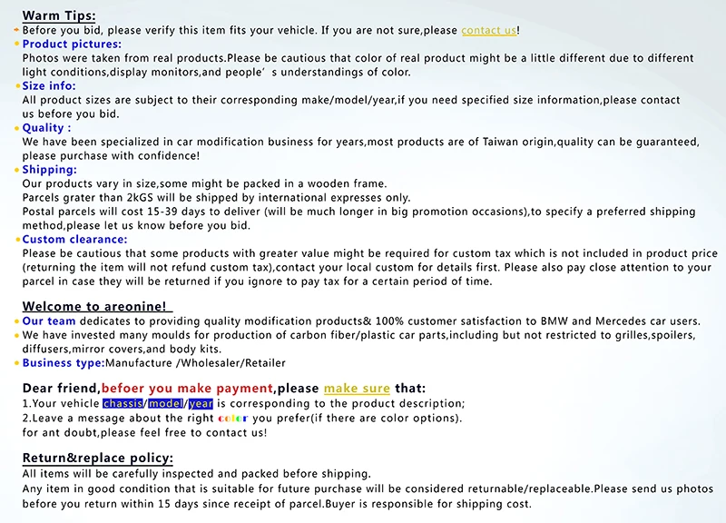 Примечание: фитинг: если вы не уверены в том, что ваш автомобиль/фитинг, пожалуйста, свяжитесь с нами прежде, чем сделать заказ. Установка: если вы не уверены, как установить товар, вы можете взять его в свой местный автомобиль изменить магазин, чтобы установить его. Налоги: сумма заказа не содержит таможенные налоги, покупатель несет ответственность за уплату налогов в соответствии с локальными таможенными налогами. доставка: Обычно, это занимает около 3-5 дней, чтобы произвести его и проверить его. После окончательной упаковки, мы отправим его как можно скорее; пожалуйста, внимательно проверьте посылку перед подписанием, если он сломался, пожалуйста, Отверните его или свяжитесь с нами сначала (если клиент подписал сломанный товар, вам необходимо оплатить стоимость обратной доставки, а затем мы отправим вам новый товар). Если у вас есть какие-либо проблемы, пожалуйста, не стесняйтесь связаться с нами, мы решим проблемы в один рабочий день. Если вы не удовлетворены, пожалуйста, свяжитесь с нами, прежде чем открыть спор. Если вы довольны нашей продукцией, пожалуйста, дайте нам 5 звезд отзывы. Для BMW LCI E93 трансформер 2 двери автомобиля Корпус зеркала заднего вида колпачки добавить на стиль 3 серии M3 вид ABS глянцевый черный 1:1 замена 10-13