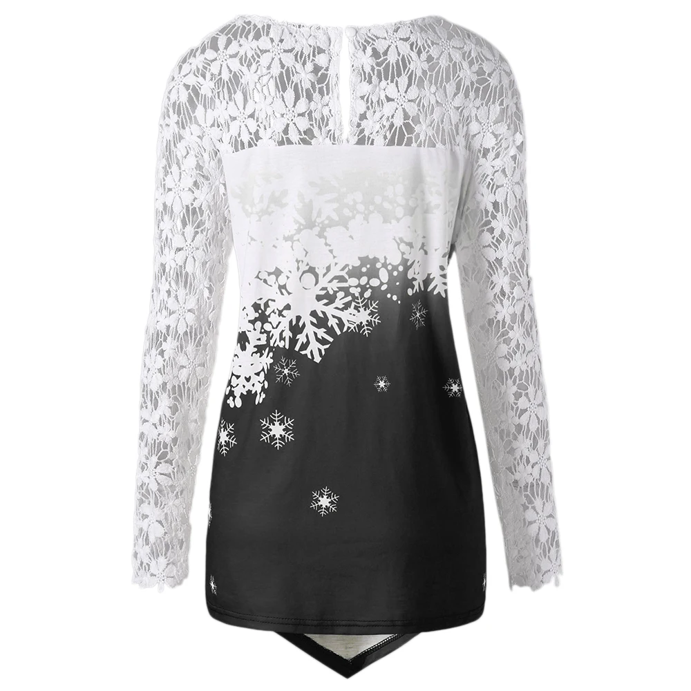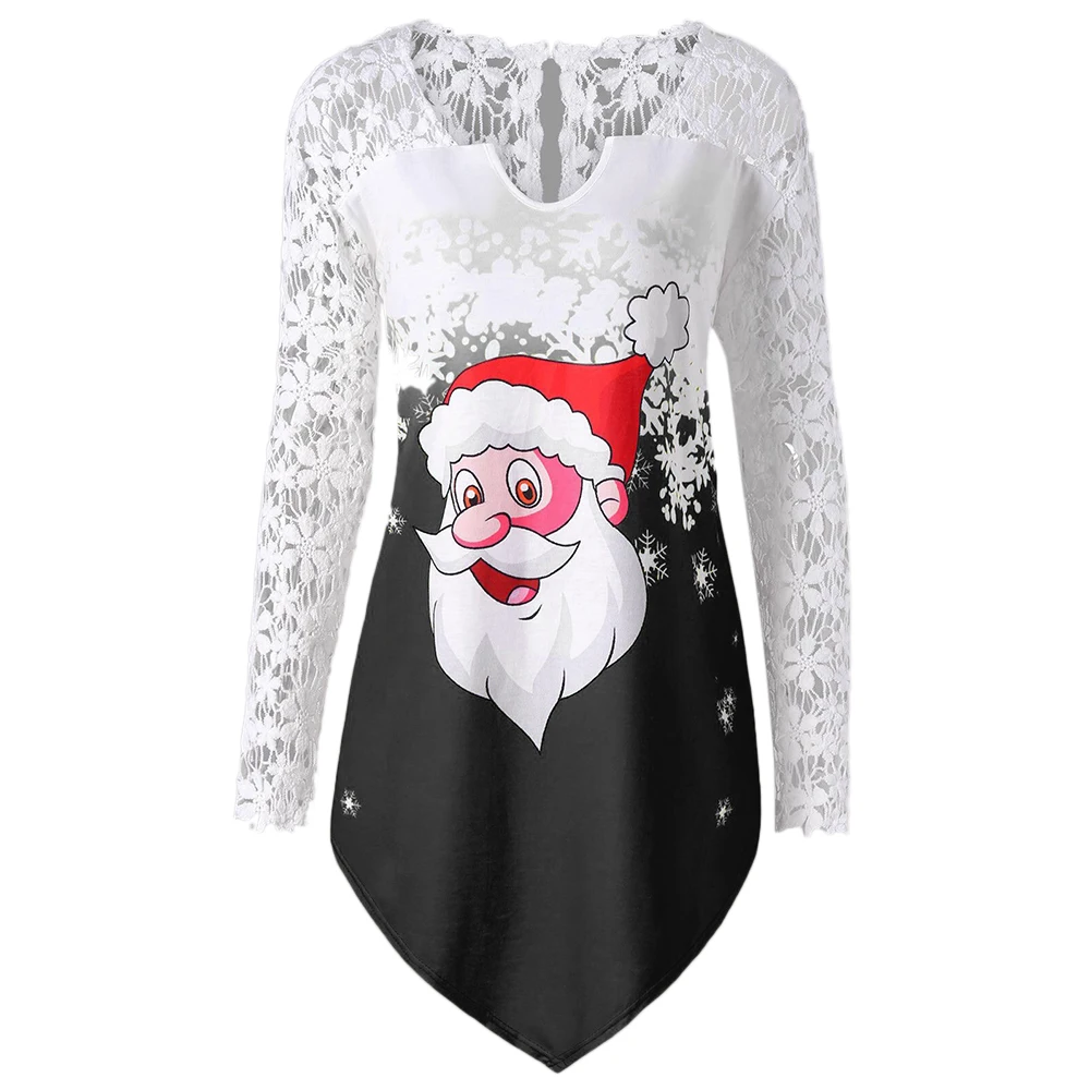 Нежный и женский, этот милый топ с длинными рукавами с цветочной кружевной отделкой на хомуте и рукавах. Вырез на спине. V-образный вырез. Принт Санта-Клауса придает изделию праздничный вид.