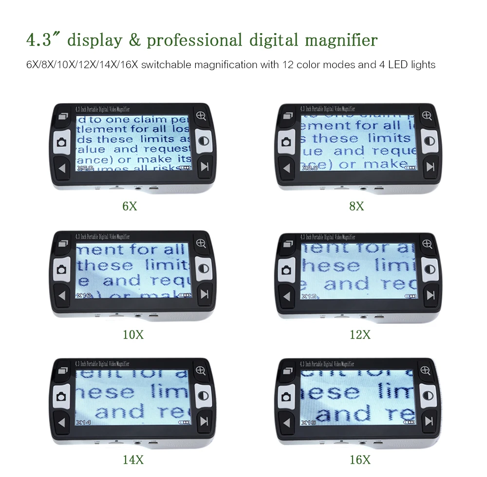 Этот 4,3 дюймовый портативный ЖК-цифровой видеолупа отлично подходит и профессиональная видеолупа для катаракты, глаукомы, макулярной дегенерации, оптической атрофии, ретинопатии, высокой близорукости, врожденного катаракта, nystagmus, альбинизма, старшеклассник с низким видением. Он имеет несколько