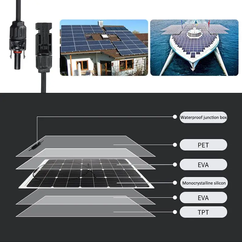 -Лист солнечных панелей может быть изогнут до 30 градусов дуги и установлен на RV, лодке, каюте, палатке, автомобиле, грузовиках, прицепах или любой другой неровной поверхности