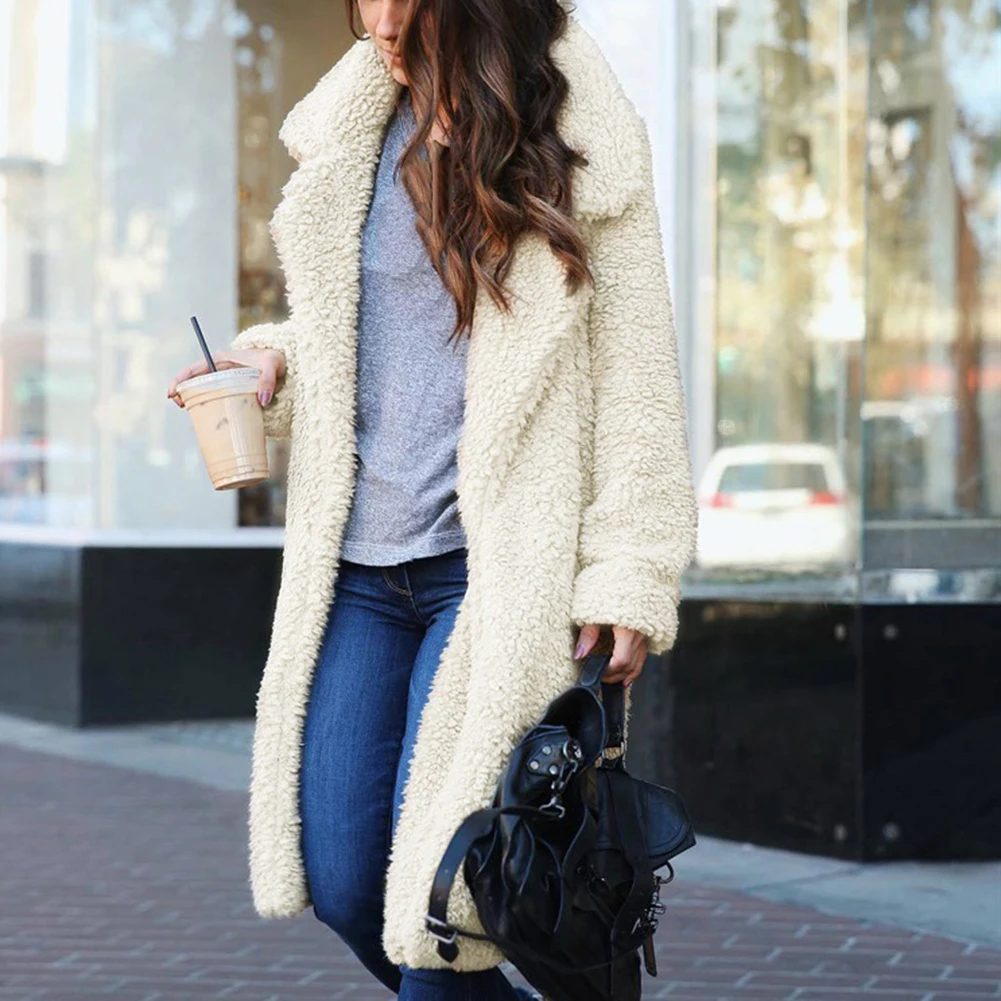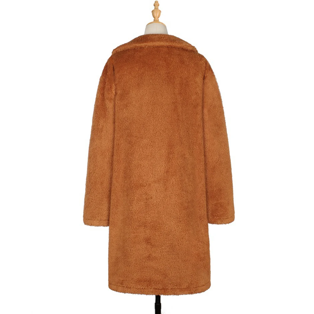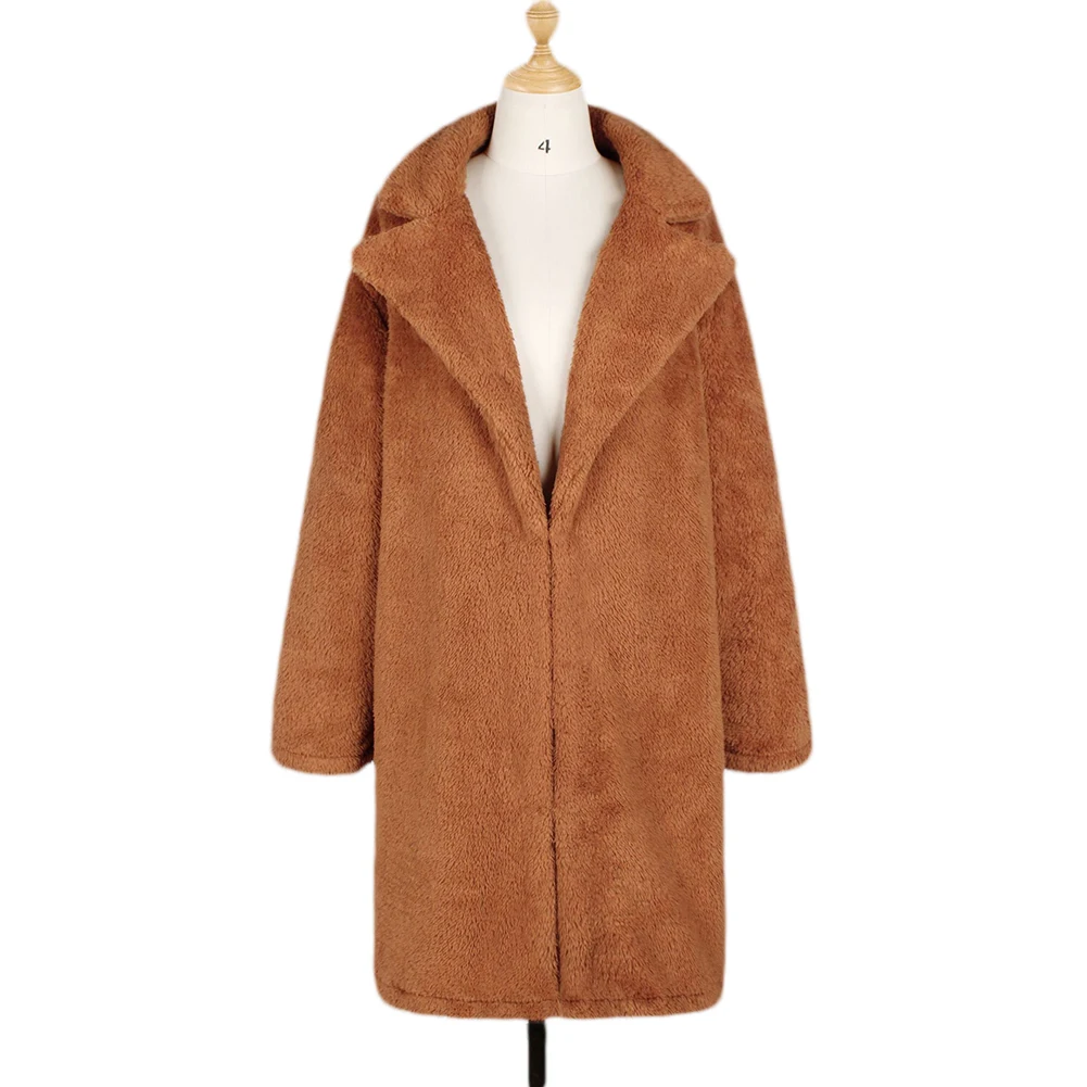 Женская свободная однотонная плюшевая флисовая куртка с длинными рукавами и отворотом, пальто средней длины, верхняя одежда