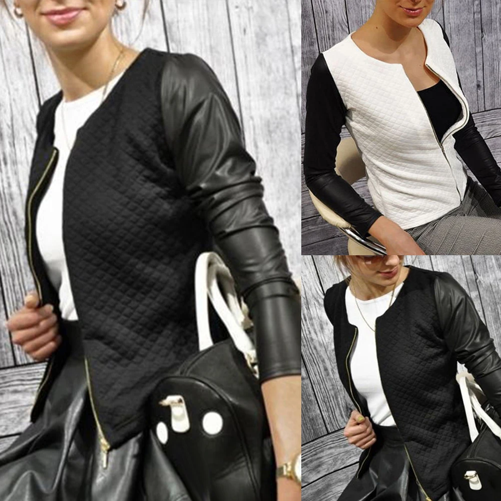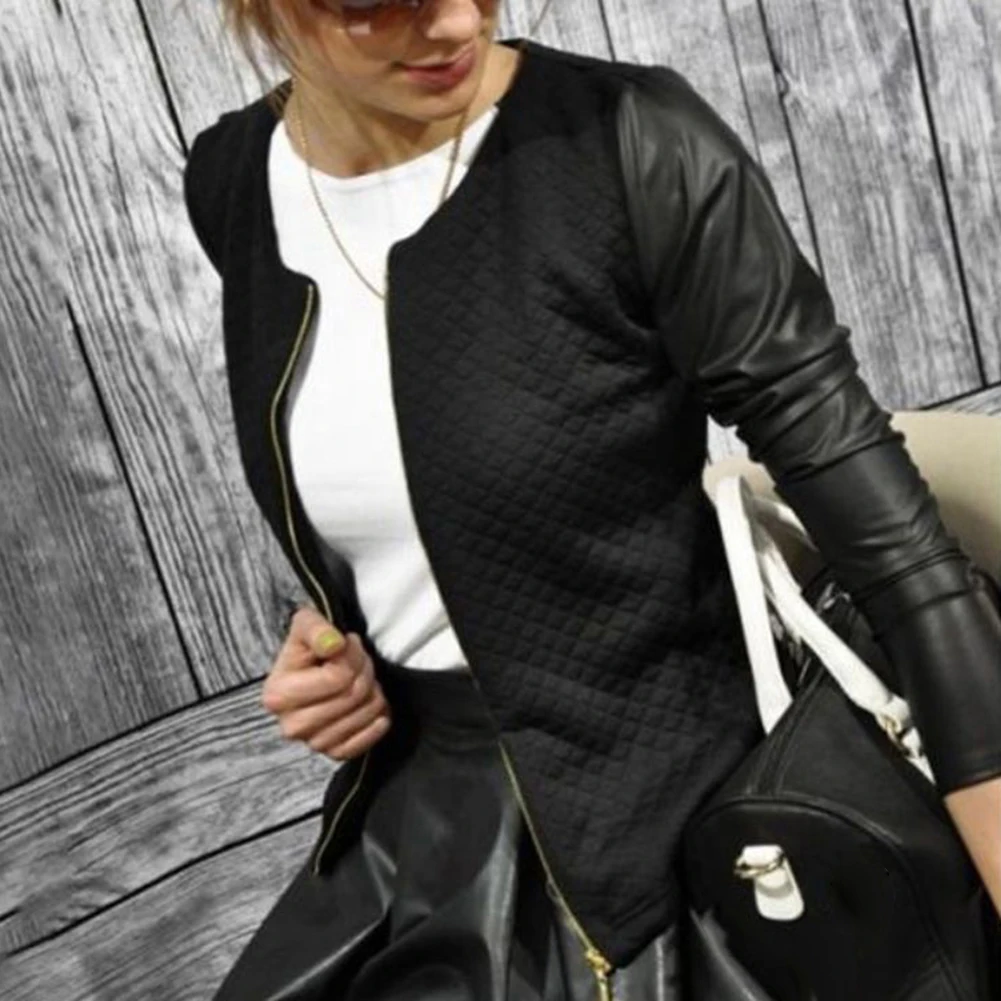 Модная женская куртка из искусственной кожи в стиле пэчворк с длинным рукавом, короткое пальто