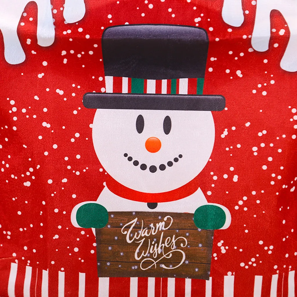 Красная ткань имеет более праздничную атмосферу, милые узоры Санта-Клауса и снеговиков, надевая эти рождественские шапки прямо на стулья, отличный способ сделать Рождественский ужин намного веселее!