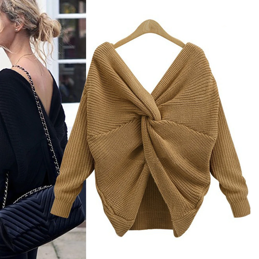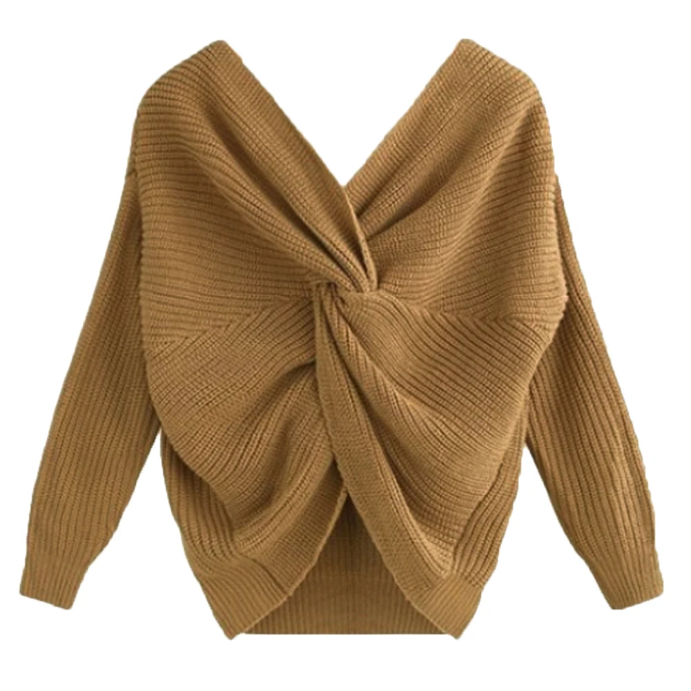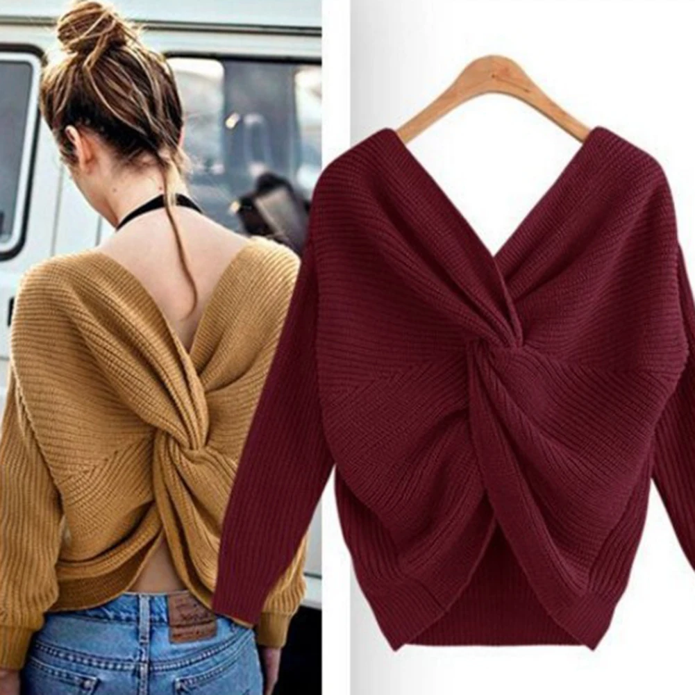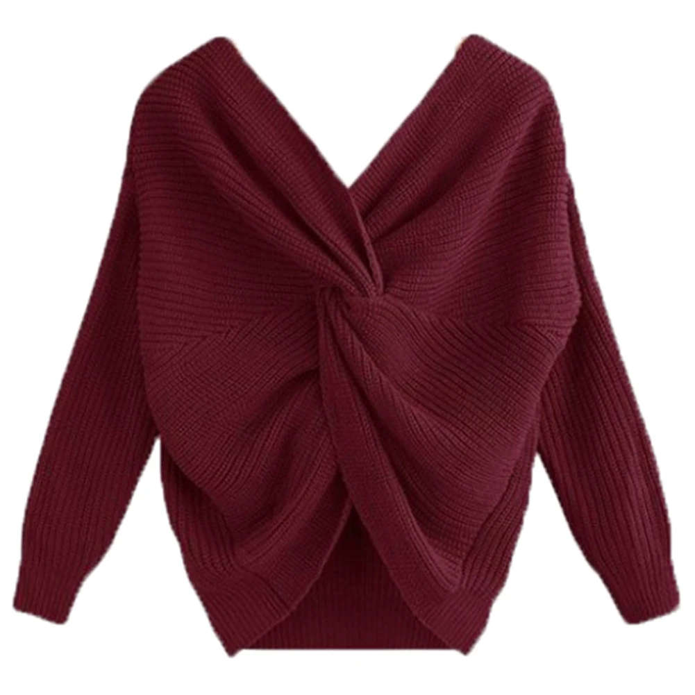 Autumn Winter Women Sweaters Twisted Backless Women Jumpers Solid Color Slim V Neck Sweater Jumper per