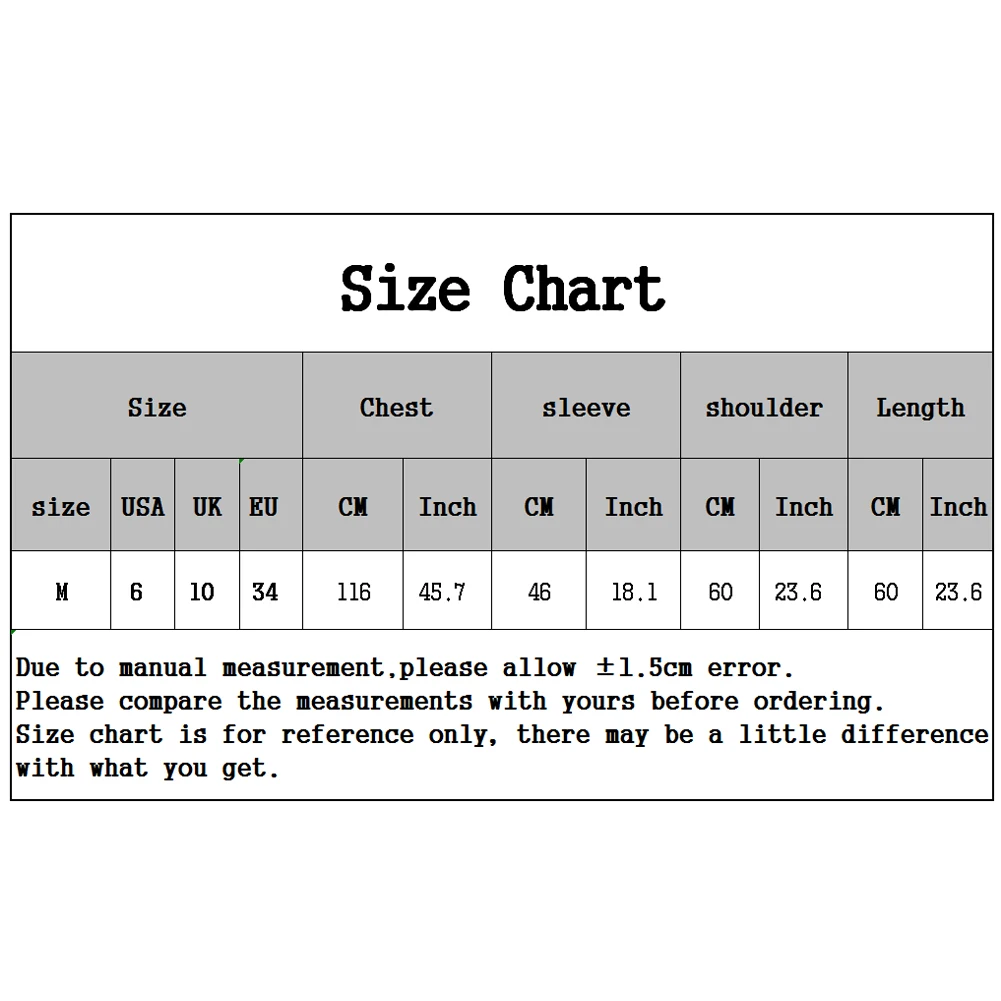 Length: 60cm/23.62", Bust: 116cm/45.67", Shoulder: 60cm/23.62", Sleeve: 46cm/18.11" (Approx.)