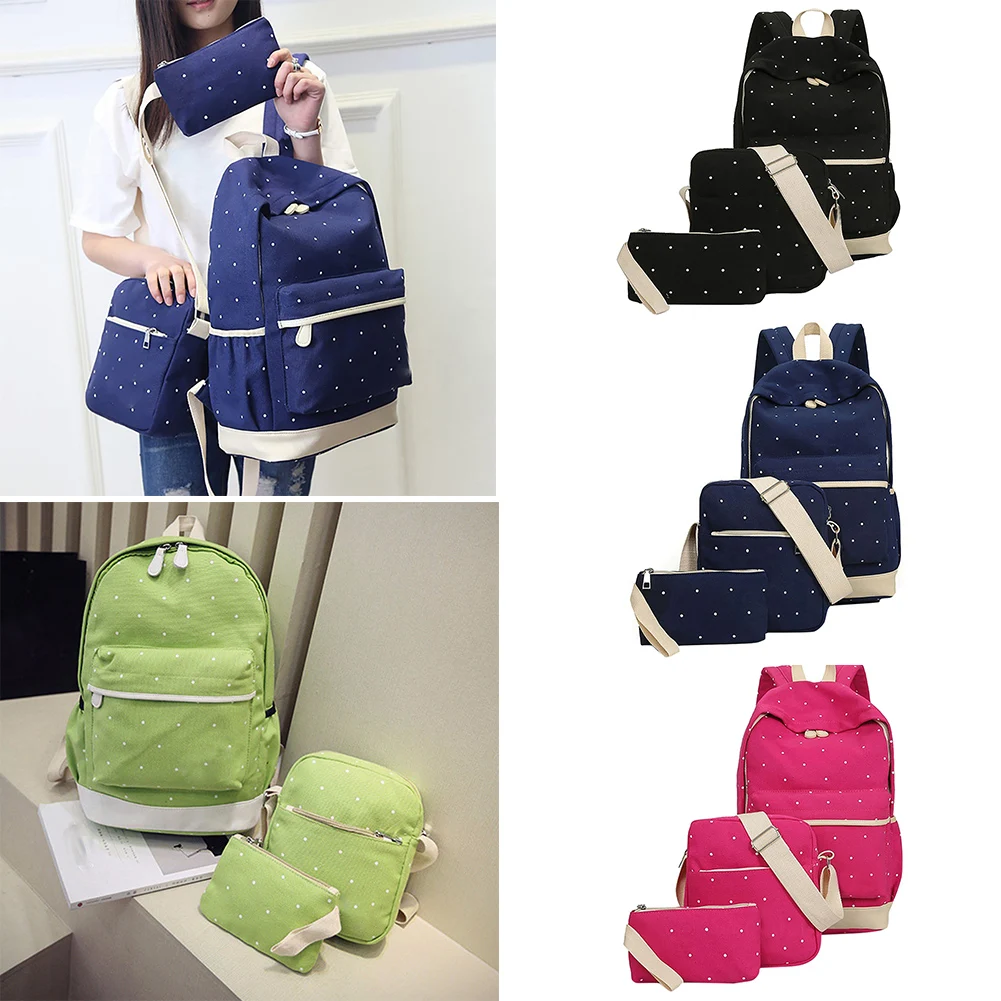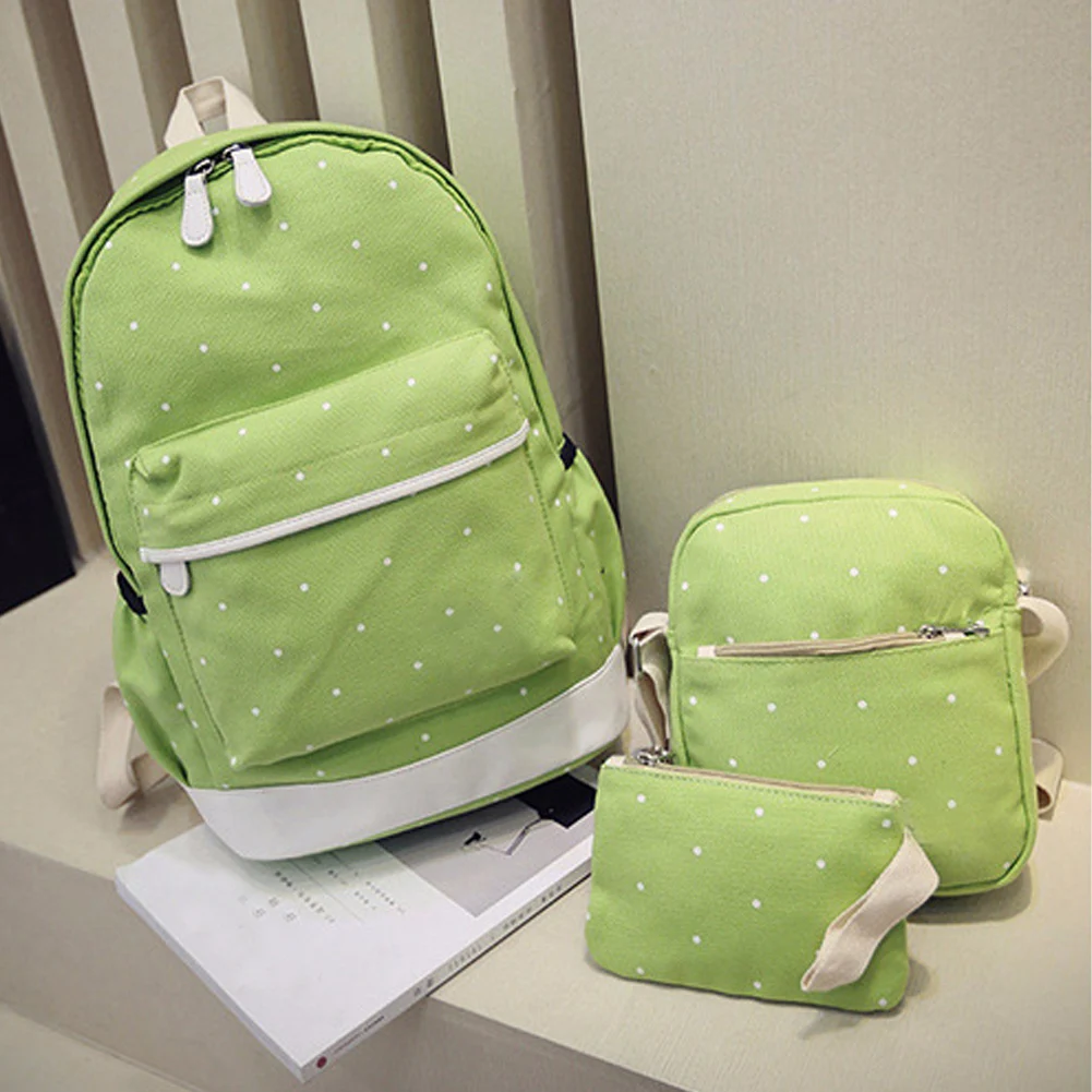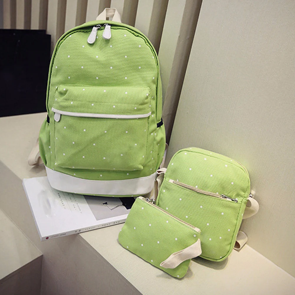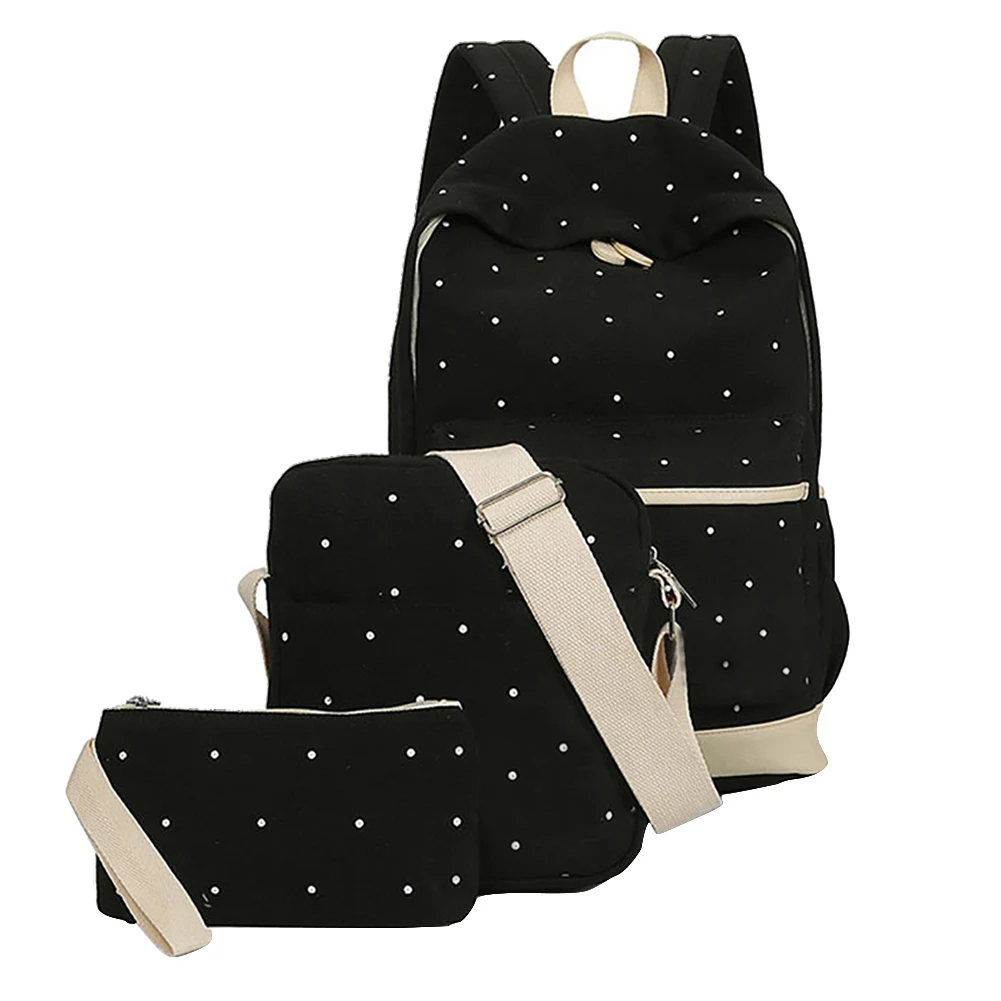 С рюкзаком, сумкой через плечо и сумочкой в комплекте с таким же дизайном.