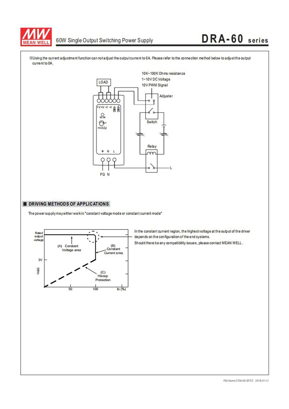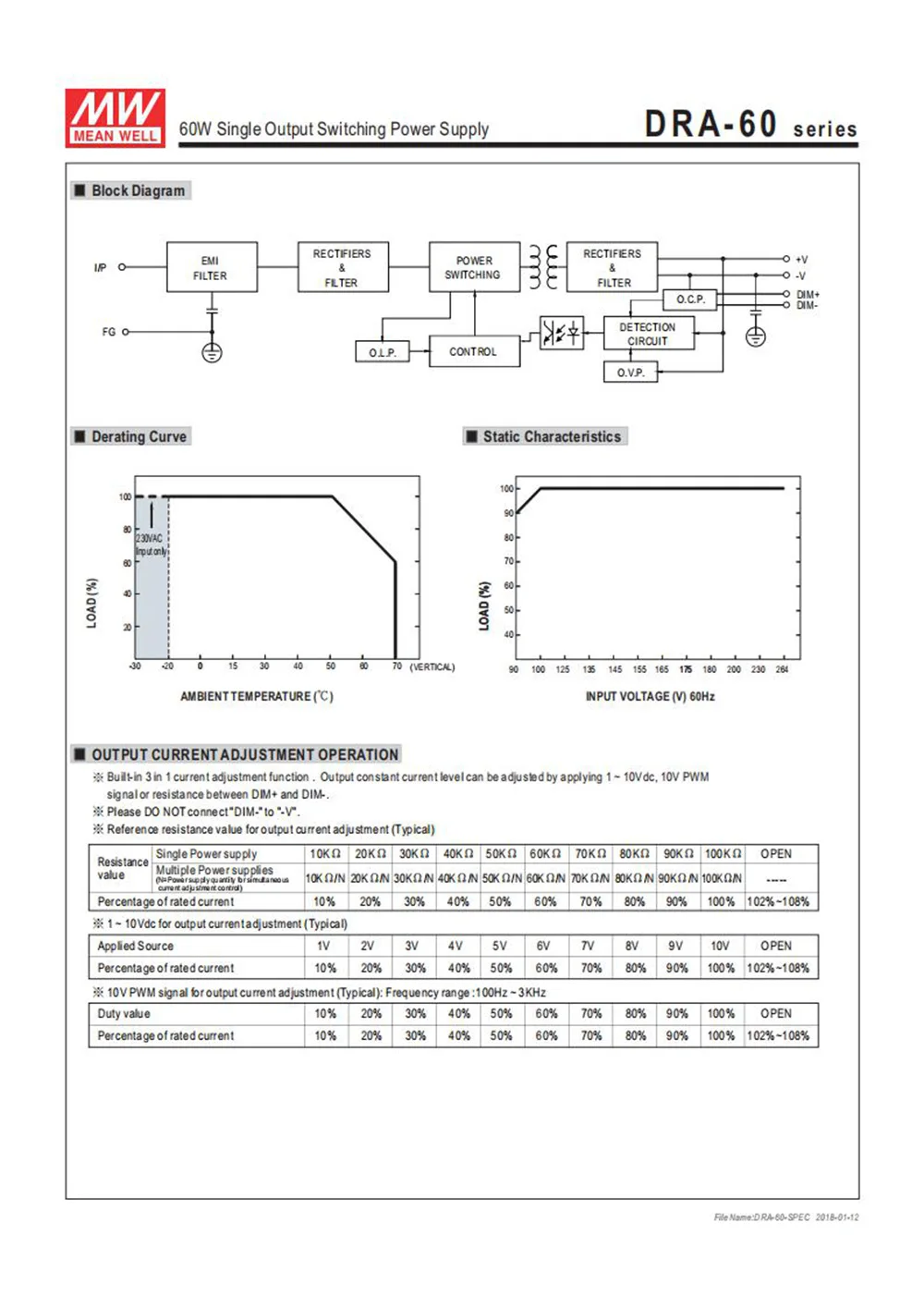 DRA-60 один 60 Вт AC/постоянный ток din-рейка питания, с регулируемым выходным током. Пользователи могут легко изменить постоянный выходной уровень тока, через 1 ~ 10Vdc, PWM сигнал или сопротивление. DRA-60 можно установить на din-рейку TS-35/7,5 или 15; кроме того, ширина блока составляет всего 40 мм, что он хорошо подходит для установки в ограниченном расстоянии. DRA-60 принимает Универсальный вход переменного тока между 90VAC и 264VAC; эффективность до 87%, что вся серия может работать, под свободной Конвекцией Воздуха, от-30 до 70 °C.