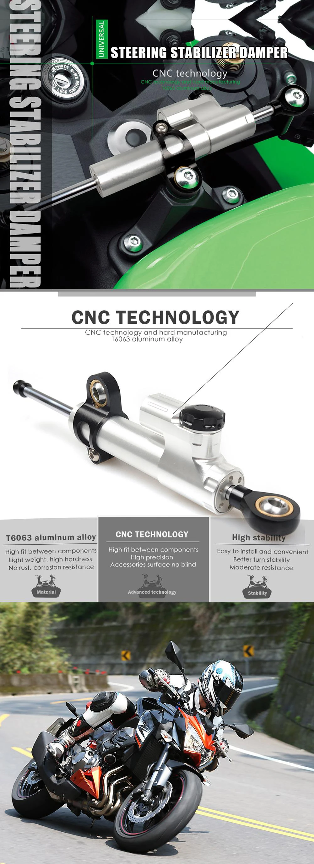 Универсальный стабилизатор рулевого управления мотоцикла с ЧПУ демпферДля YAMAHA KTM ДюкATI BMW, Suzuki HONDA... Состояние:100% новый и высокое качество. Применимость:Универсальный для большинства мотоциклов/уличных велосипедов Основное Описание: Установка Обратите внимание: Посылка включает в себя: