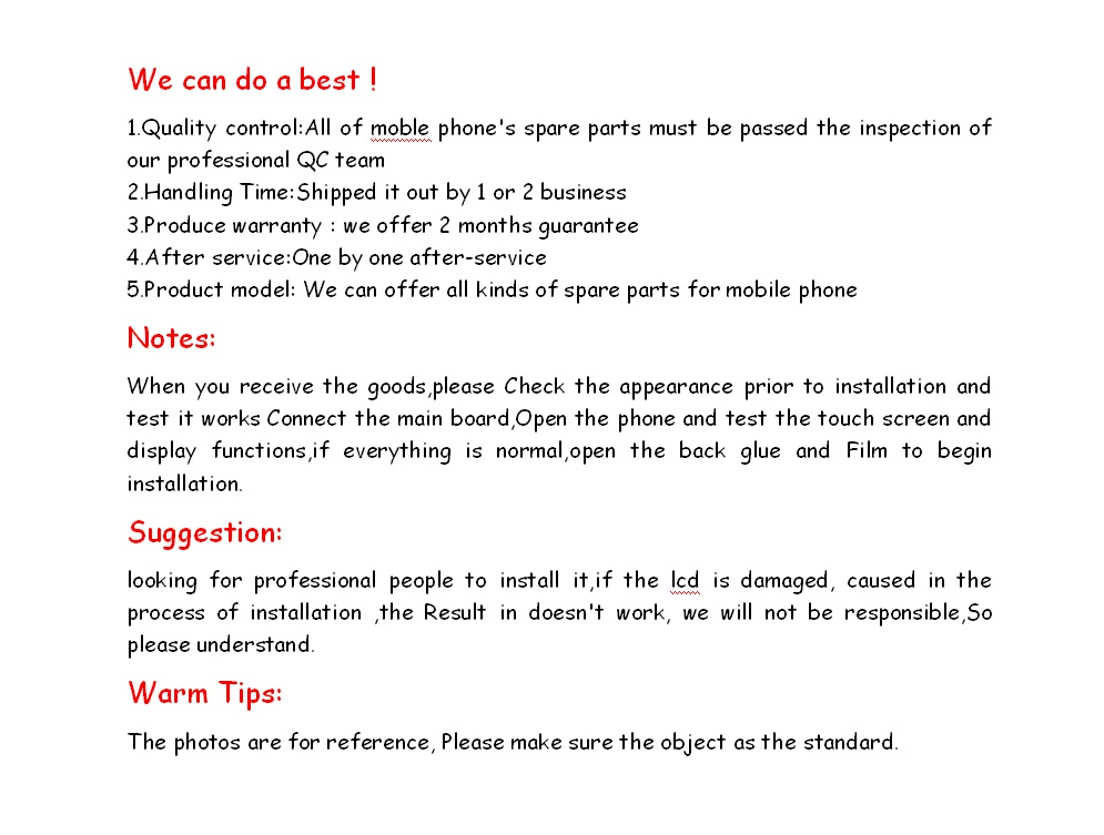 Советы: 1. Пожалуйста, проверьте его перед установкой. (Помните!) 2. ЖК-дисплей хрупкий и легко ломается или работает неправильно при ошибках установки. 3. Если вы не можете заменить ЖК-дисплей, пожалуйста, сделайте это профессиональным человеком или ремонтным магазином. 4. Мы не несем ответственности за любые ошибки в установке. Что вы получите? (2 комплекта) 5 * сенсорный ЖК-дисплей 5 * закаленное Стекло