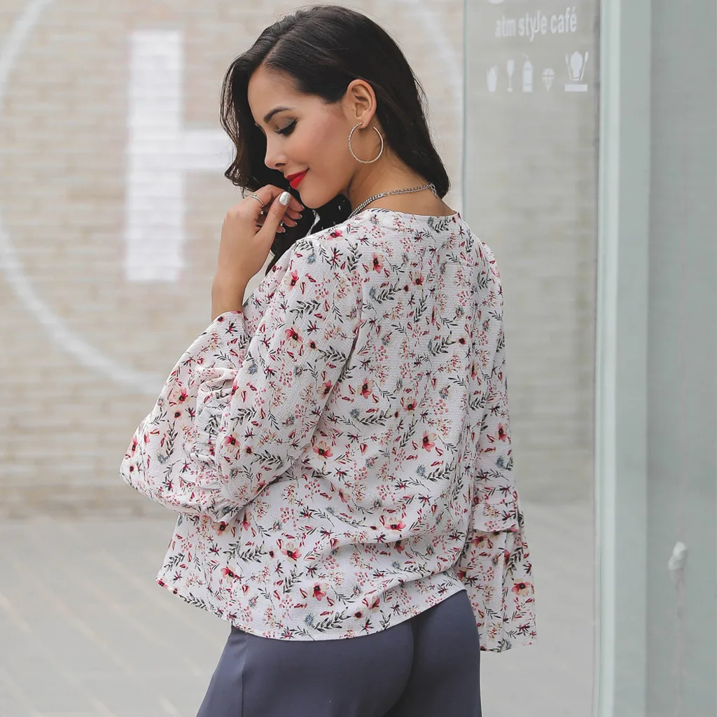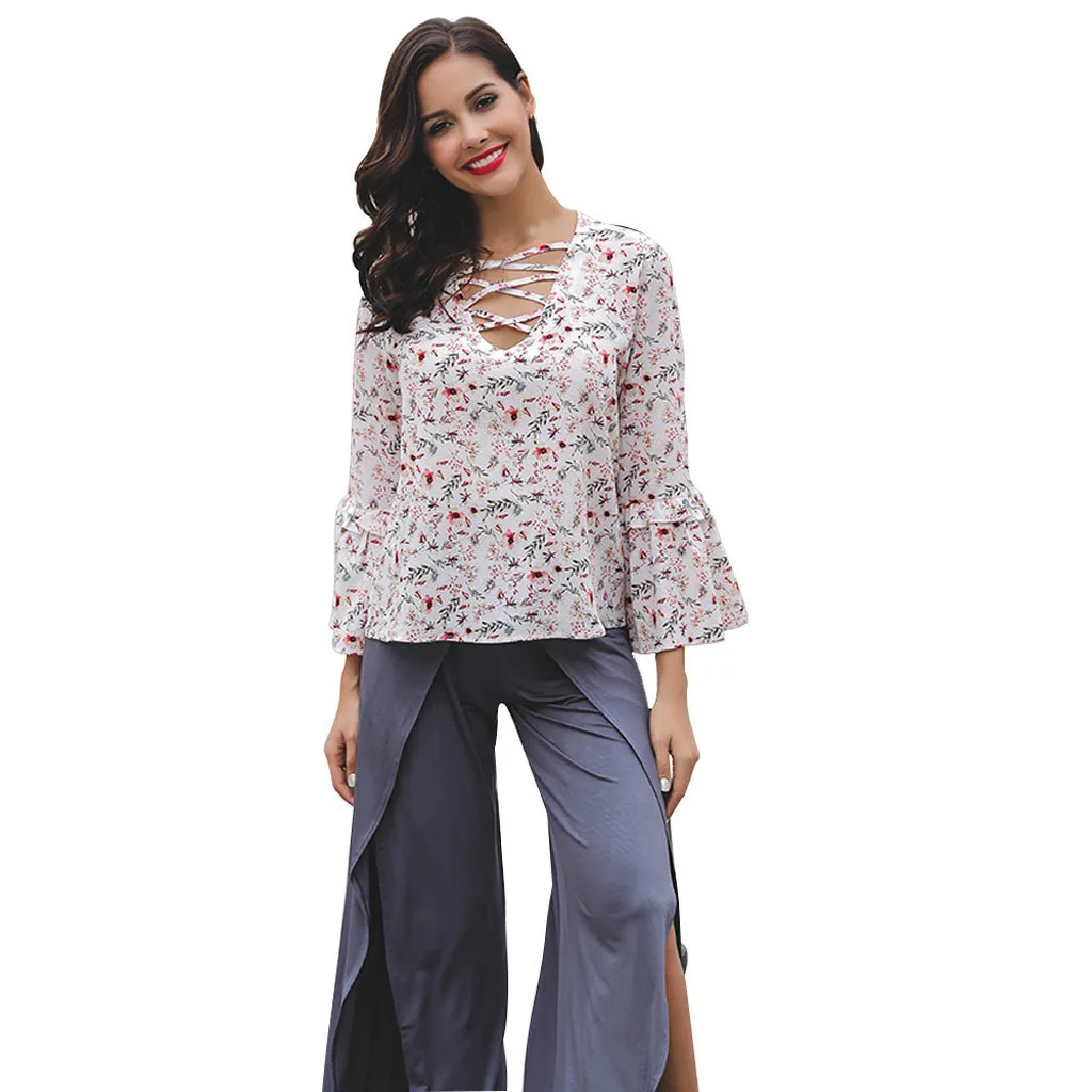 Женский Повседневный длинный рукав колокол V шеи цветочный принт крест свободный джемпер Топы Блузка