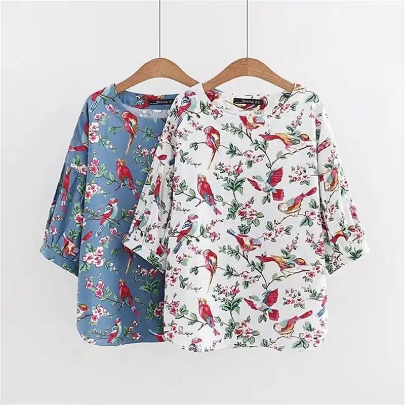 Плюс размер хлопок; Лен; с вышивкой свободные женские футболки Весна чай три кварта фонари рукавом дамы случайные o-образным вырезом футболки$14,49./Стук