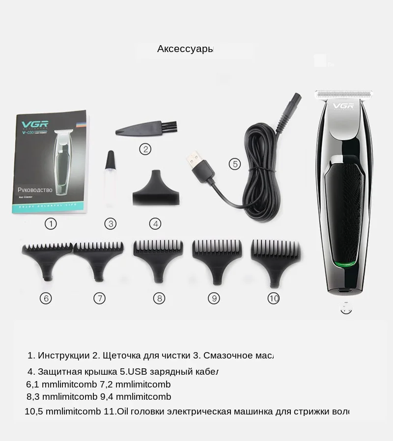 * Название продукта: VGR 0 резак резные ножницы • Модель: V030 * Знать в конце: режущая головка из нержавеющей стали * Вес нетто: 131 г * Размер корпуса: 15x4,5x3,5 см * Время зарядки: 1,5 ч * Время использования: 2 ч * Напряжение: 100-240V ~ 50/60 HZ * Мощность: 10 Вт * Режим питания: USB Перезаряжаемый * Метод очистки: мытье ножей