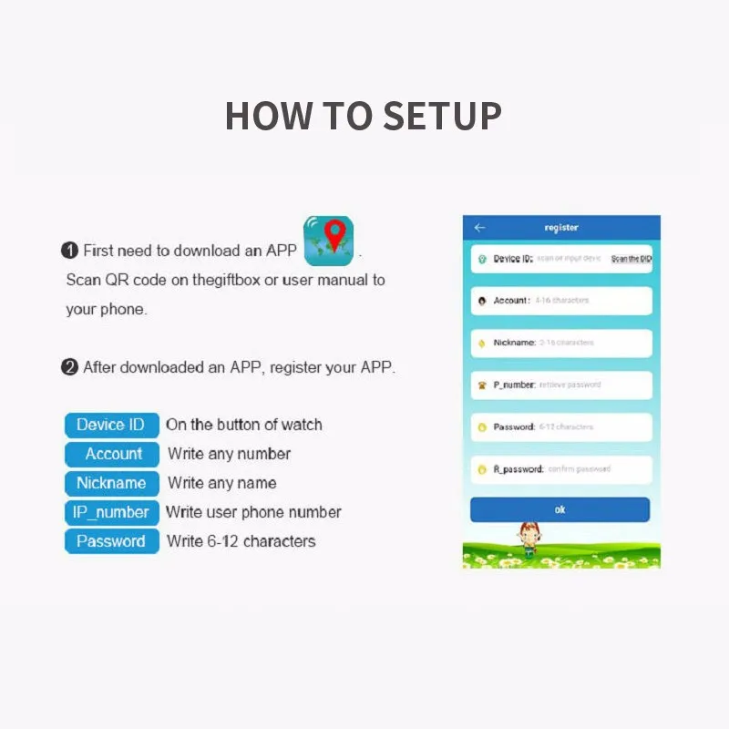 * Анти-потеря: после регистрации смарт-часов в вашем телефоне, приложение будет онлайн. Если кто-то берет ваши часы с запястья вашего ребенка, ваш телефон предупредит вас.