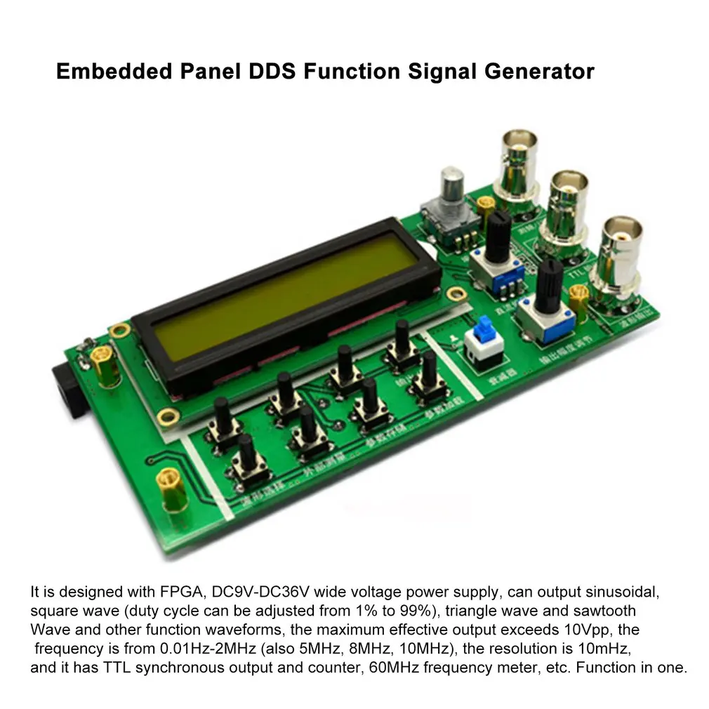 2. Он разработан с FPGA, DC9V-DC36V широким источником питания напряжения, может выводить синусоидальную, квадратную волну (рабочий цикл может быть отрегулирован от 1% до 99%), треугольную волну, волну sawtooth и другие функциональные формы, максимальная эффективная выходная мощность превышает 10Vpp, частота от 0,01 Гц-2 МГц (также 5 МГц, 8 МГц, 10 МГц), Разрешение составляет 10 МГц, и он имеет синхронный выход TTL и счетчик, Частотный метр 60 МГц и т. д. функция в одном.