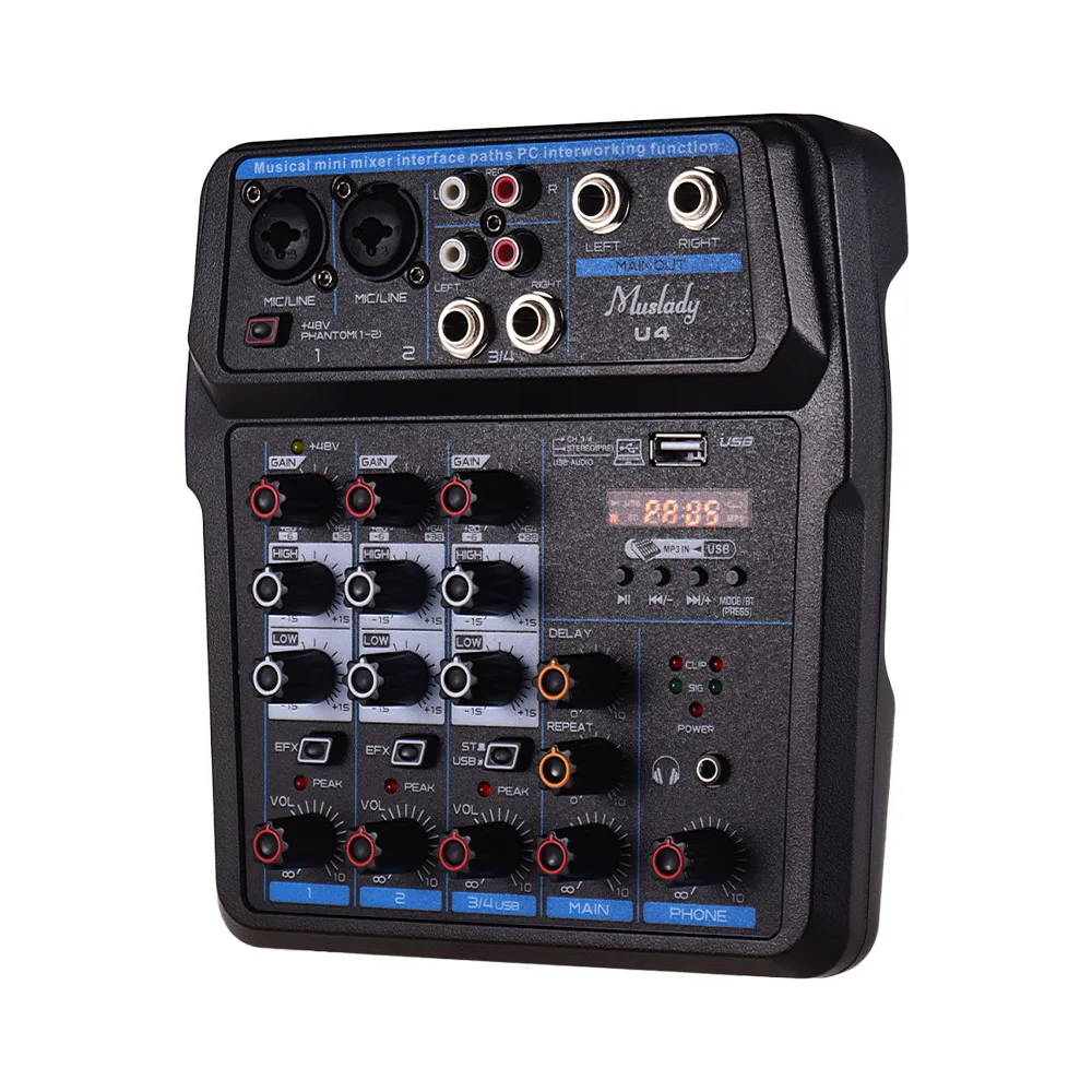 Микшерная консоль Muslady U4 имеет 2 канала моно и 1 канал стерео входов, 1 набор стереовыхода; Поддержка подключения BT.