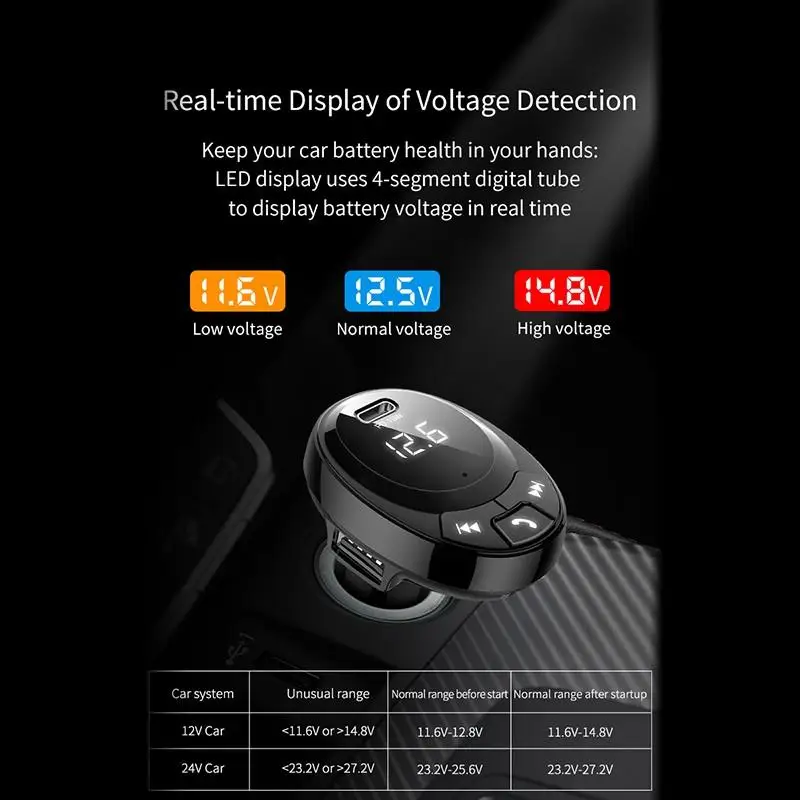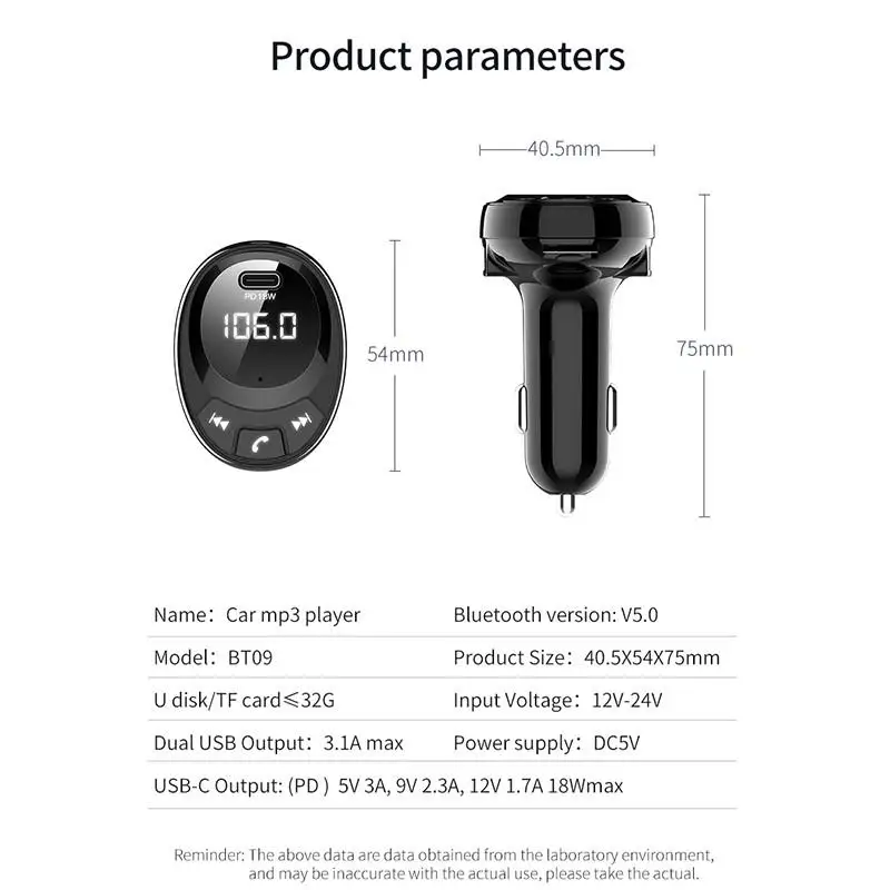 Версия Bluetooth: V5.0 Поддерживающие протокол: A2DP, AVRCP, HFP, HSP Частотный диапазон: 87,5 ~ 108,0 МГц Дальность передачи FM: около 5 м Напряжение на входе: DC12-24V Ток на выходе: USB ток на выходе: 3,1 А Ток на выходе Type-C: 5 В/3 А, 9 В/2 А, 12 В/1,5 А (PD 18 Вт) Формат музыки: MP3, WMA, WAV,APE,FLAC U диск/TF карта (максимальная емкость): 32 ГБ