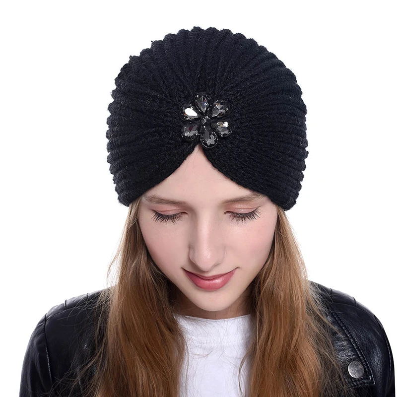 Цветок Стразы вязаная шапка модные мягкий тюрбан сплошной Цвет женская мусульманская шапка