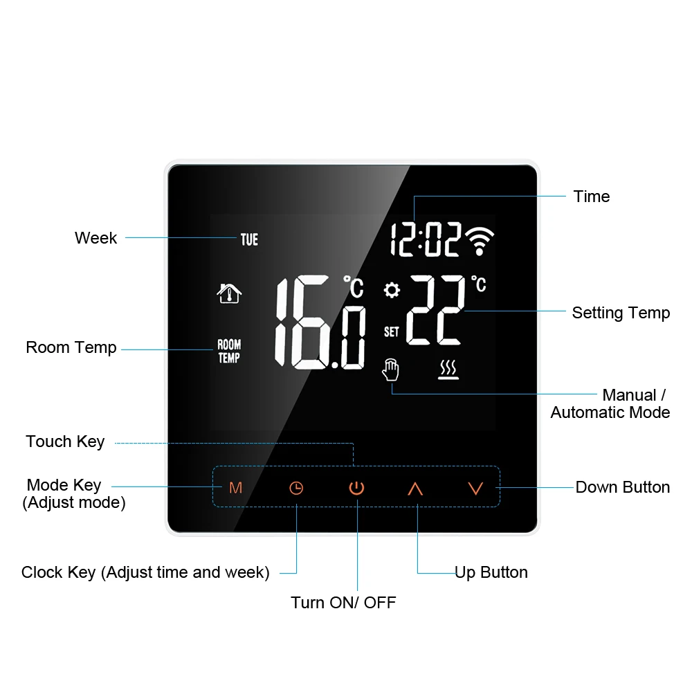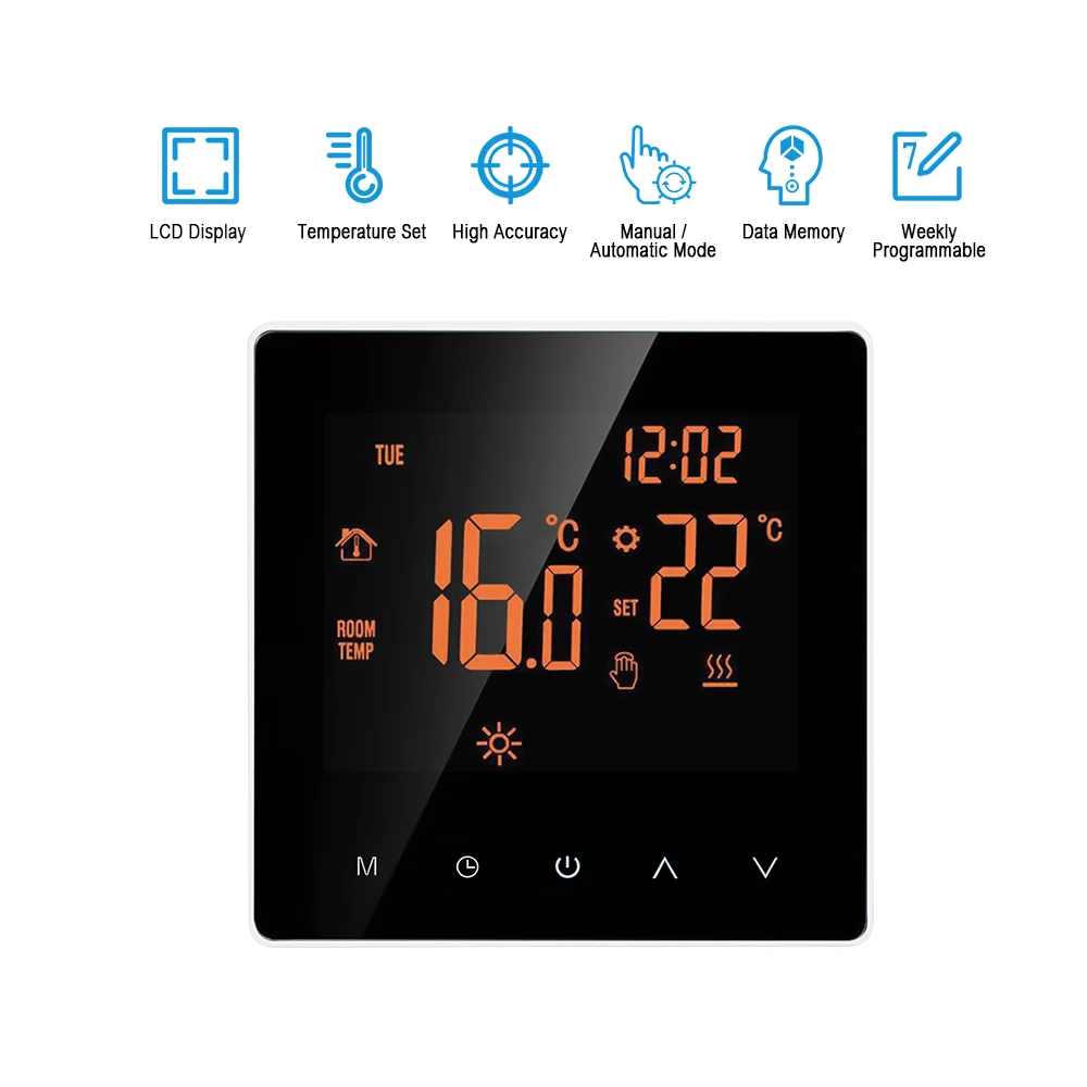 【Еженедельная программа 】термостат поддерживает различные настройки температуры соответственно с 6 временными режимами ежедневно.
