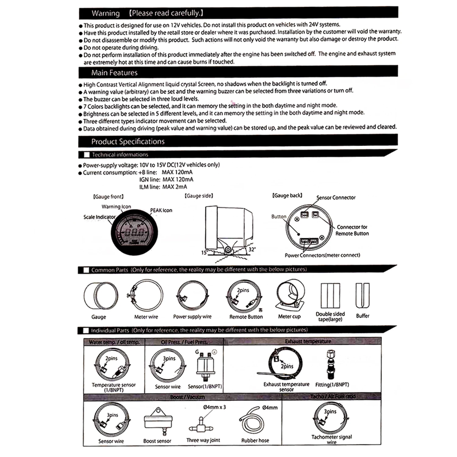Циферблат 270 ° обеспечивает быструю точность одного взгляда. Трековые испытания и гонки эти датчики используют прецизионные электрические датчики (в комплекте), чтобы держать опасные жидкости из пассажирского салона. Этот датчик отключен. Этот датчик может отображать 10 цветов и с регулируемой яркостью!
