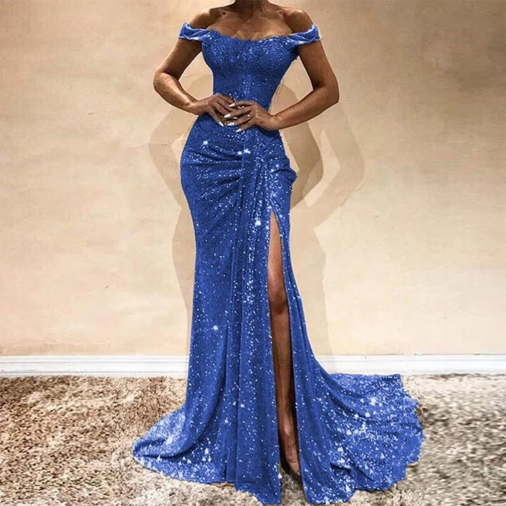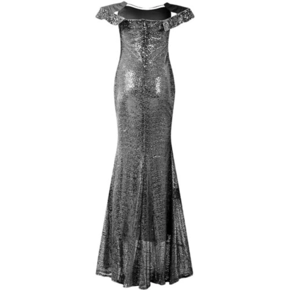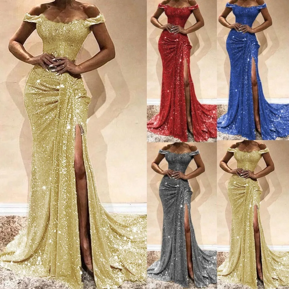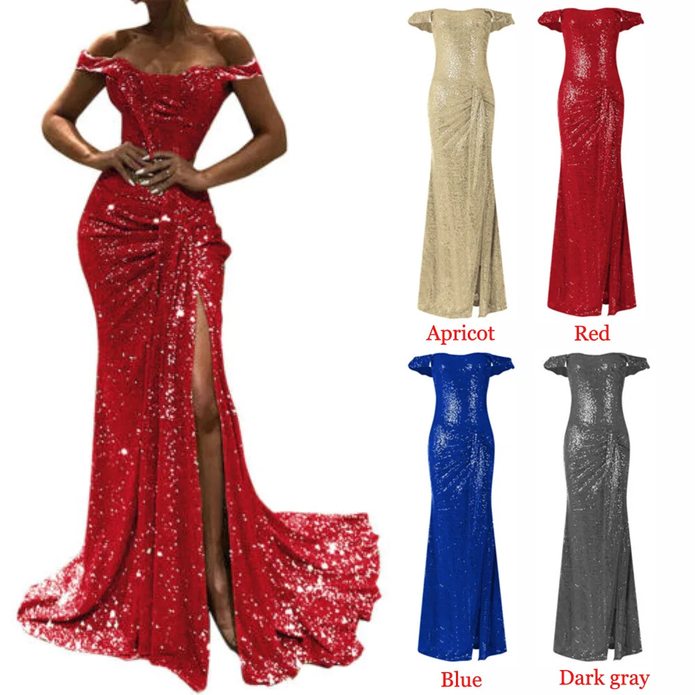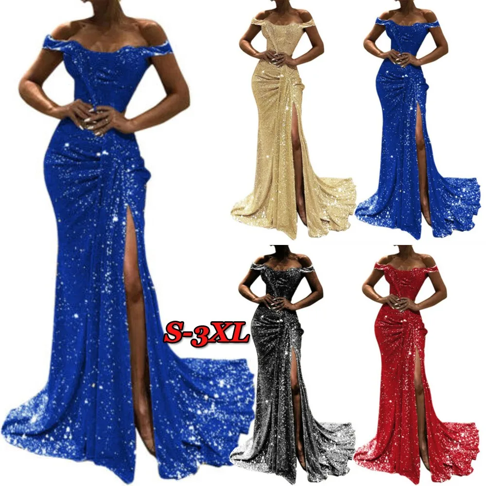 Wipalo Women Fashion Mermaid Side Split Dress Off Shoulder Bodycon Dress Sleeveless Maxi Long Sequins Gown Dress Party Vestidos