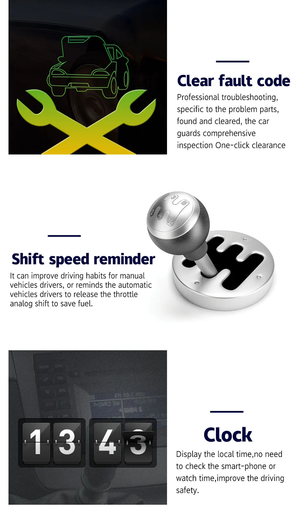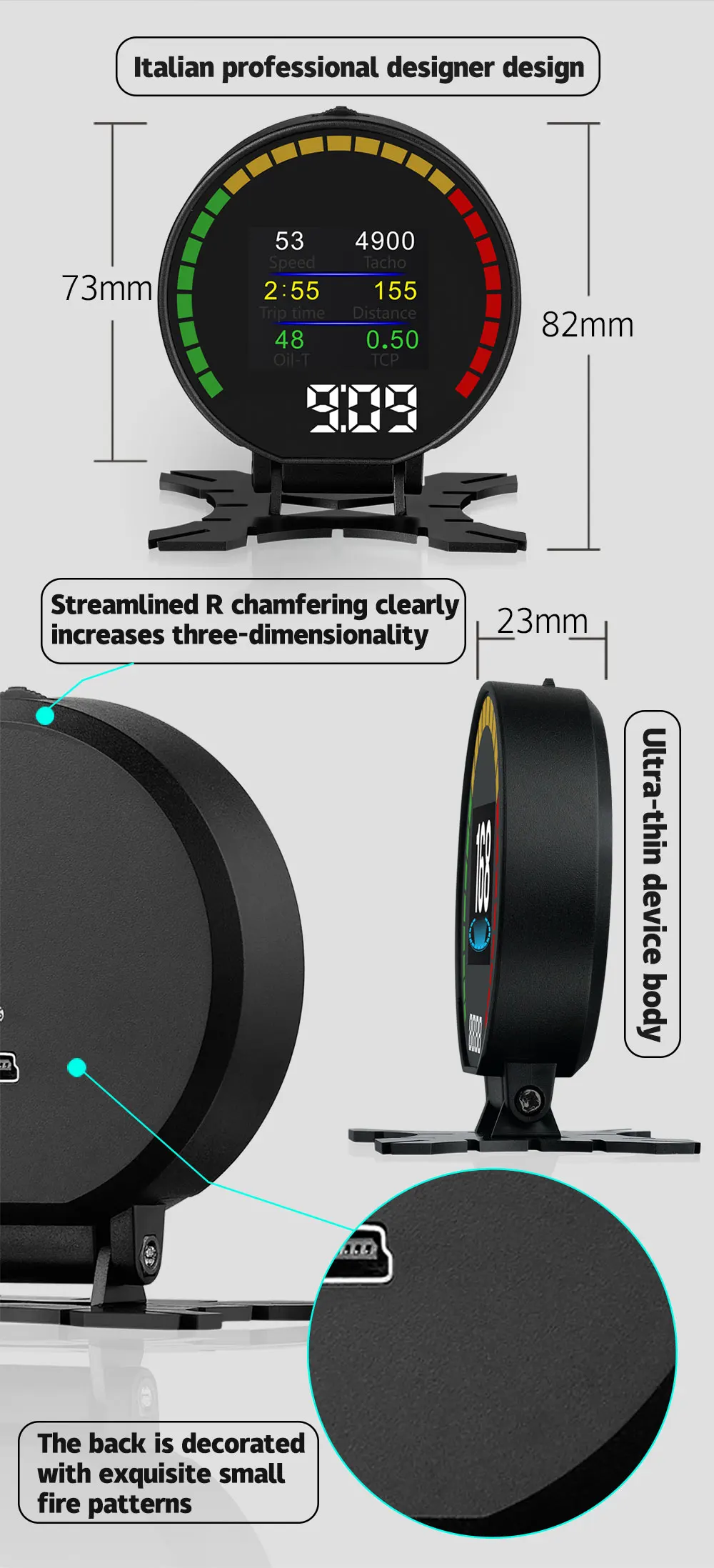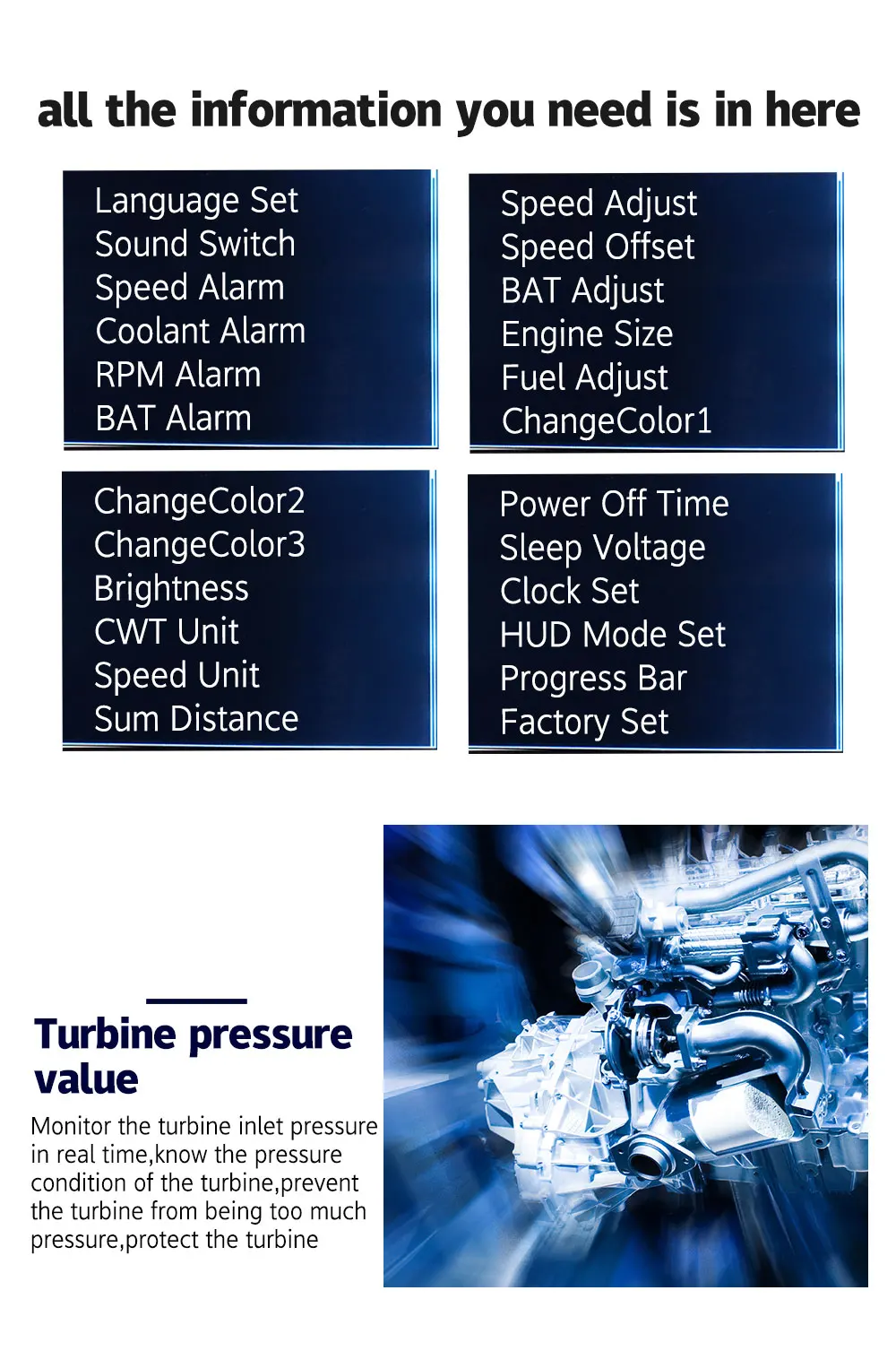 6. Богатое содержание: скорость транспортного средства, обороты двигателя, температура воды, напряжение, мгновенный расход топлива, средний расход топлива, одно расстояние вождения, общее расстояние вождения, время вождения, турбо давление, соотношение воздух/топливо, температура масла, Сигнализация низкого напряжения, сигнализация высокой температуры воды, сигнализация о превышении скорости, сигнализация о коде неисправностей двигателя, Устранение кода неисправности, свободное переключение между километрами и милями.