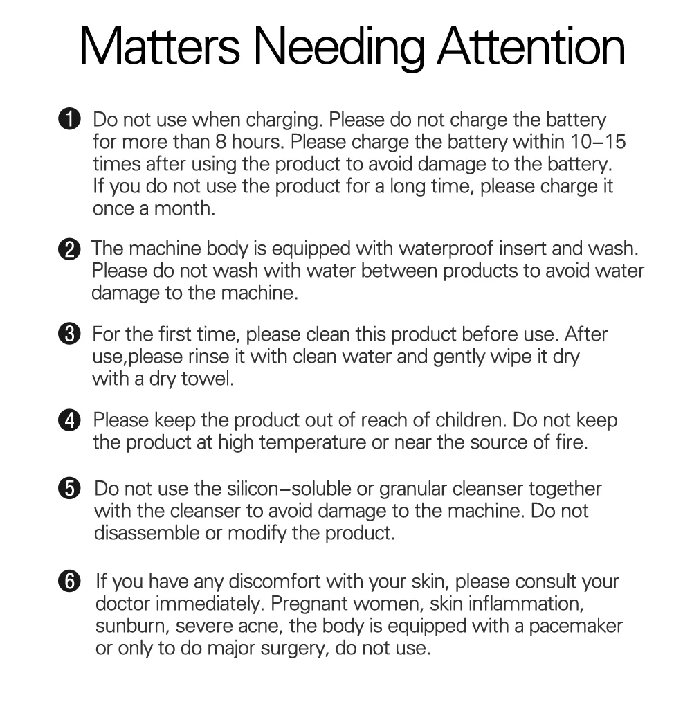 1. Не используйте при зарядке. Пожалуйста, не зарядить батарею в течение более чем 8 часов. Пожалуйста, заряжайте аккумулятор в течение 10-15 раз после использования продукта, чтобы избежать повреждения аккумулятора. Если вы не используете продукт в течение длительного времени, пожалуйста, заряжайте его один раз в месяц. 2. Корпус машины оснащен водонепроницаемой вставкой. Пожалуйста, не стирайте с водой между продуктами, чтобы избежать повреждения воды в машине. 3. В первый раз, пожалуйста, очистите этот продукт перед использованием. После использования, пожалуйста, протрите краску чистой водой и аккуратно протрите ее сухим полотенцем. 4. Пожалуйста, держите продукт в недоступном для детей месте. Не храните продукт при высокой температуре или вблизи источника огня. 5. Не используйте кремниевое или гранулированное моющее средство вместе с моющим средством, чтобы избежать повреждения машины. Не разбирайте и не модифицируйте продукт. 6. Если у вас есть дискомфорт с кожей, пожалуйста, немедленно обратитесь к врачу. Беременные женщины, воспаление кожи, солнечные ожоги, сильные прыщи, тело оснащено кардиостимулятором или только для проведения основной операции, не используйте.