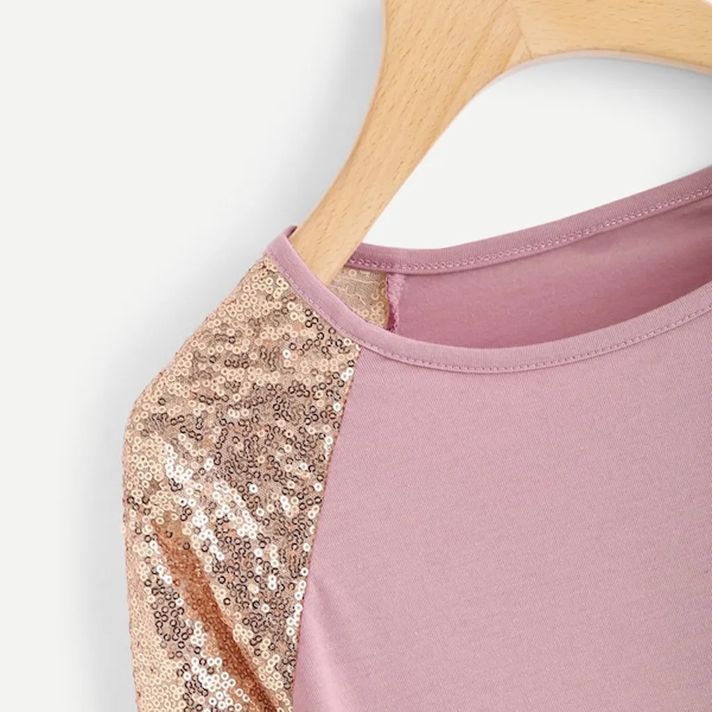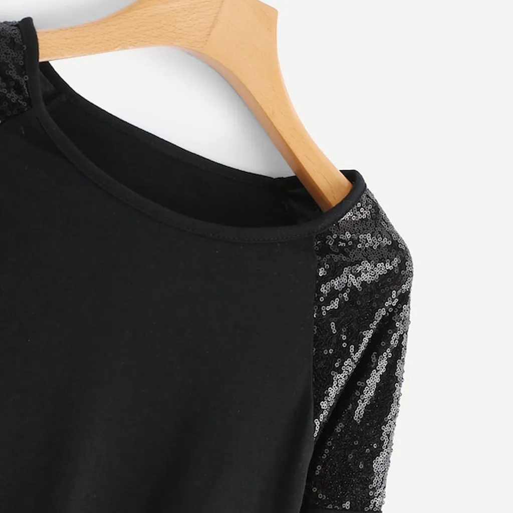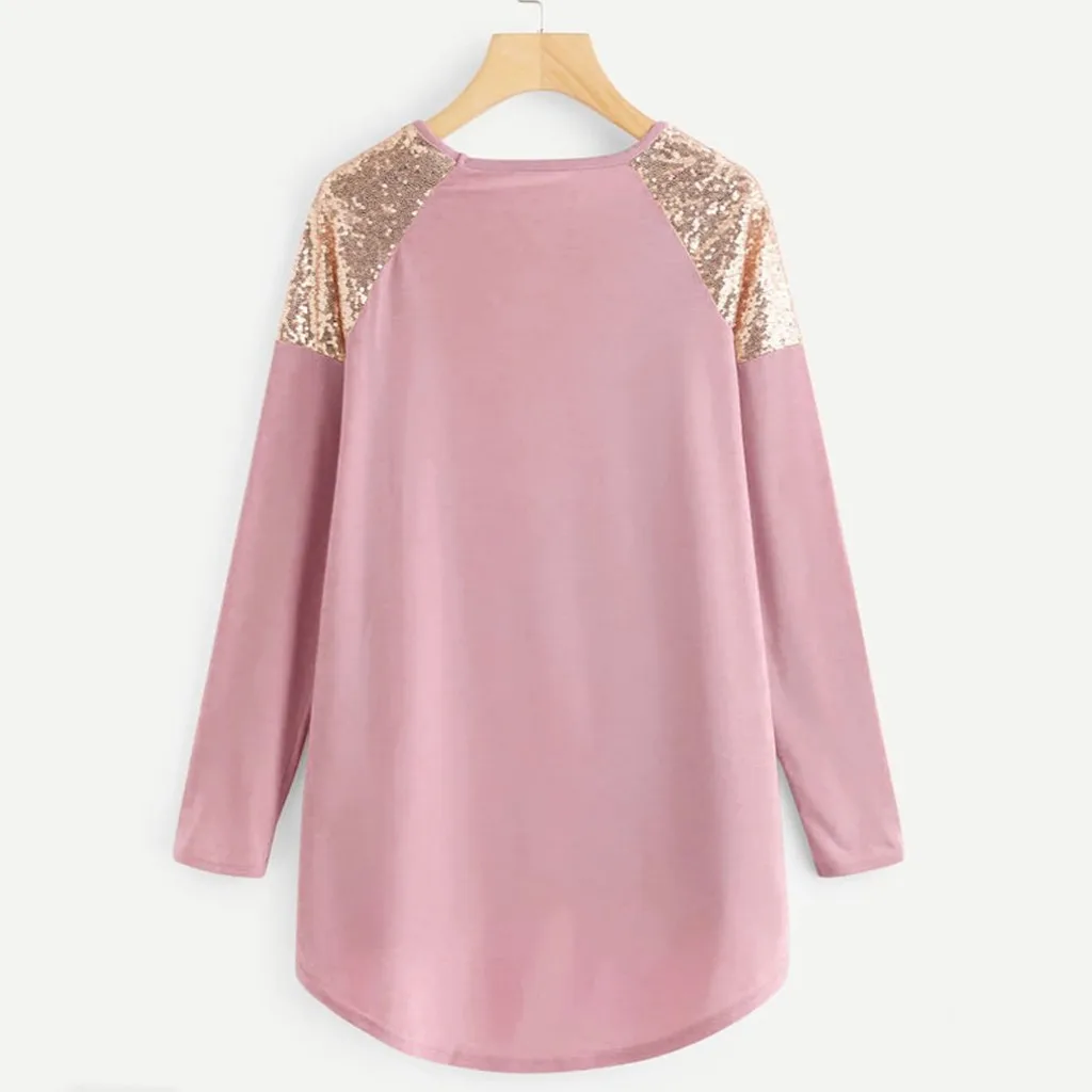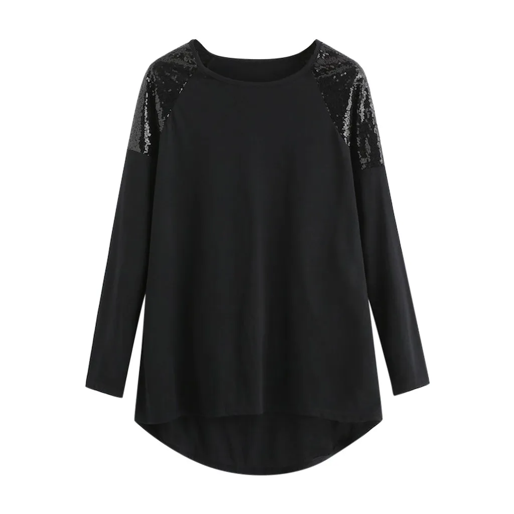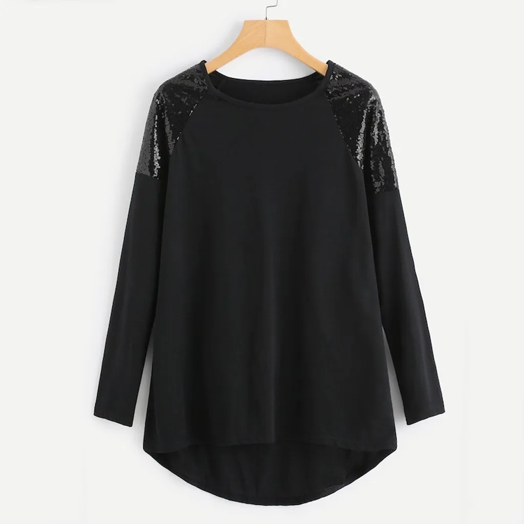 Модная женская футболка с круглым вырезом и длинными рукавами, контрастная Лоскутная футболка с блестками, большие размеры