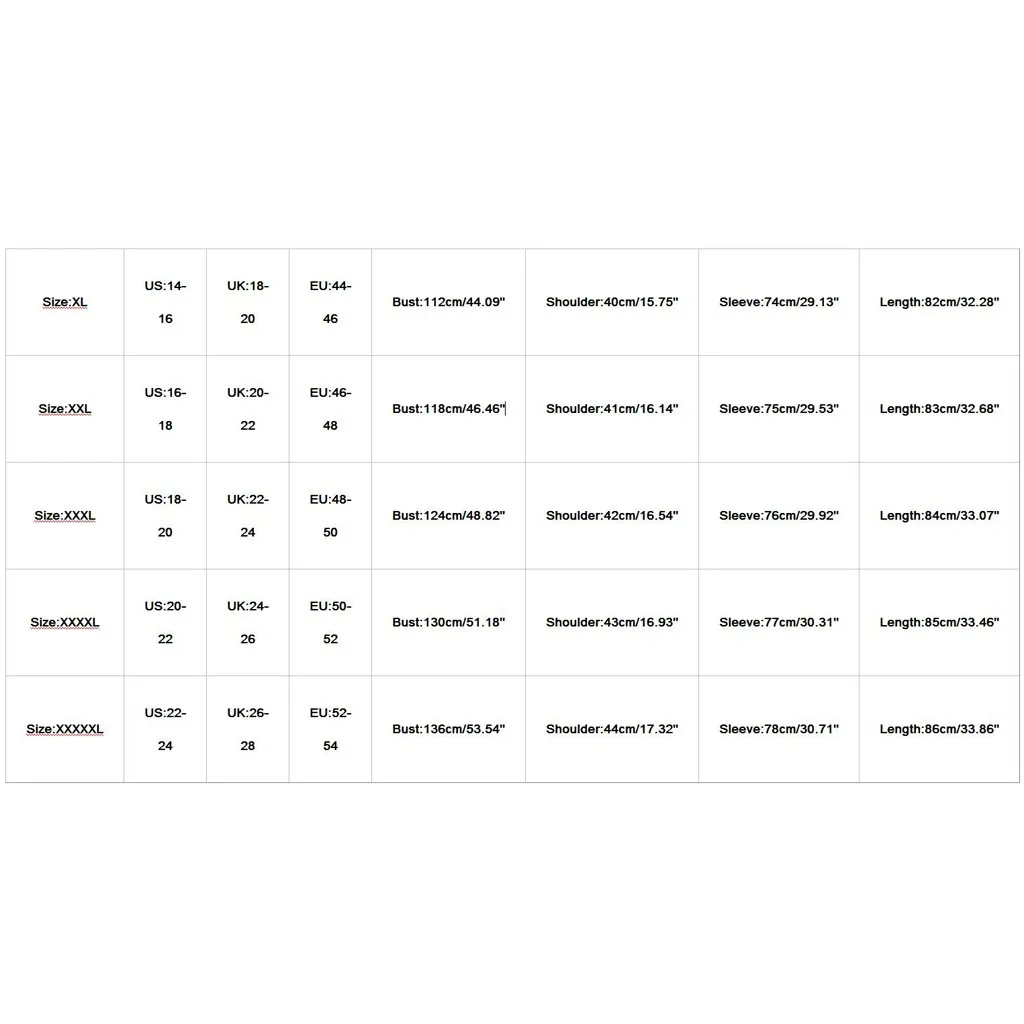 | Размер: XXL | США: 16-18 | Великобритания: 20-22 | ЕС: 46-48 | Обхват груди: 118 см/46,46 дюйма | Ширина плеч: 41 см/16,14 дюйма | Рукав: 75 см/29,53 дюйма | Длина: 83 см/32,68'' |
