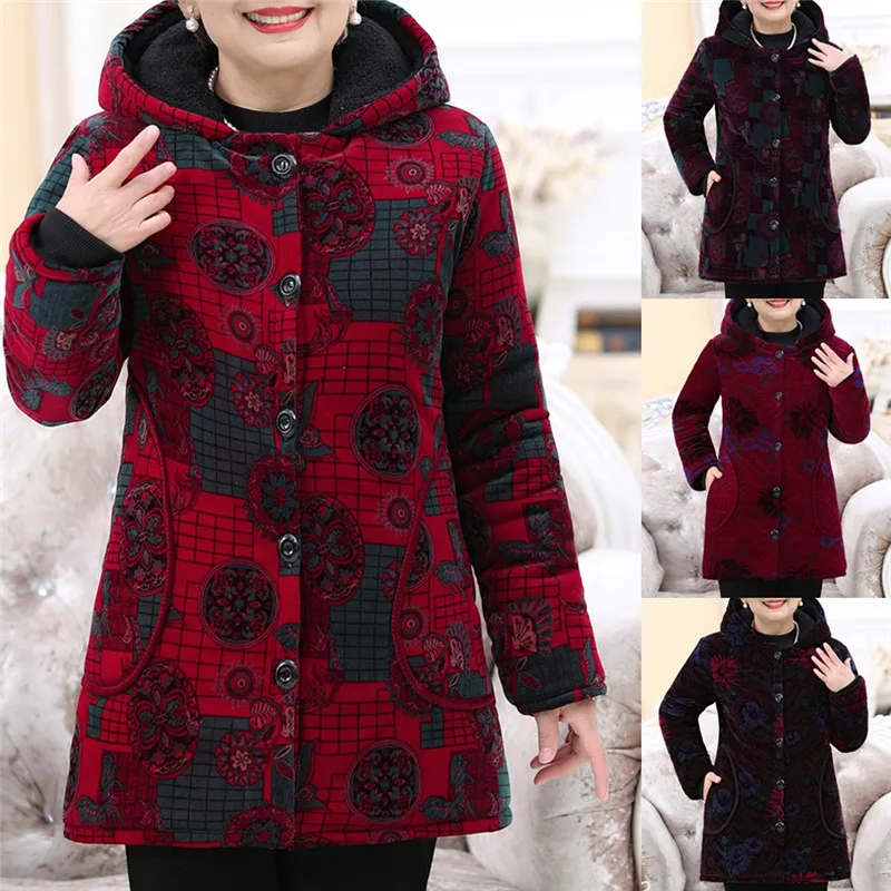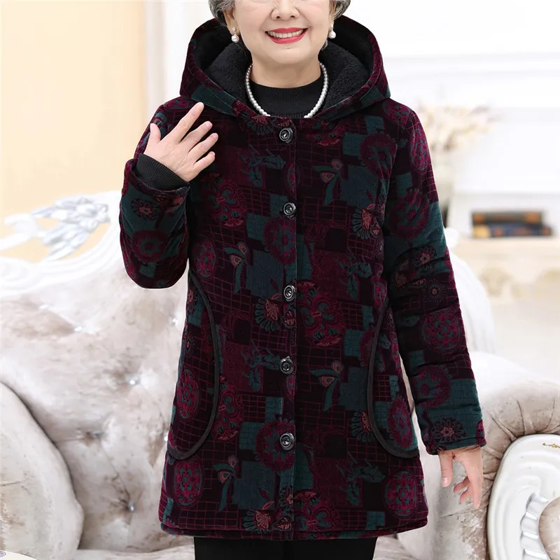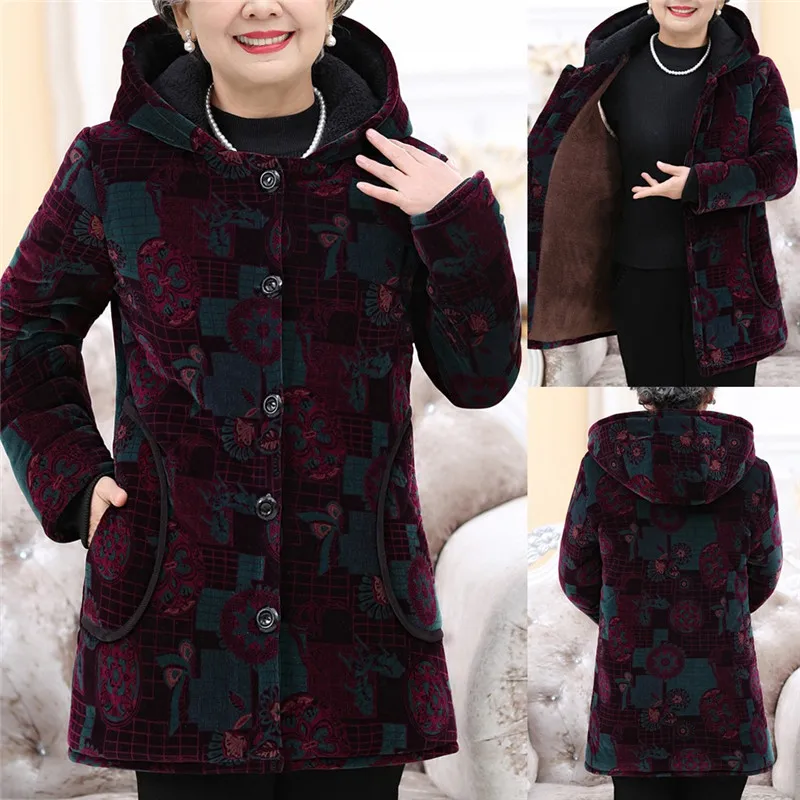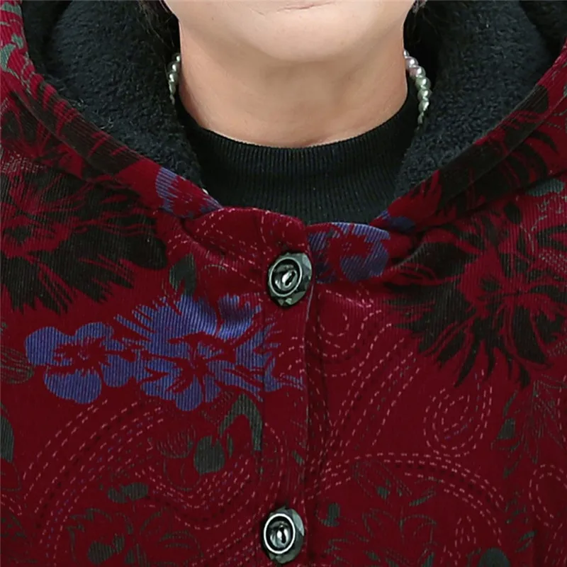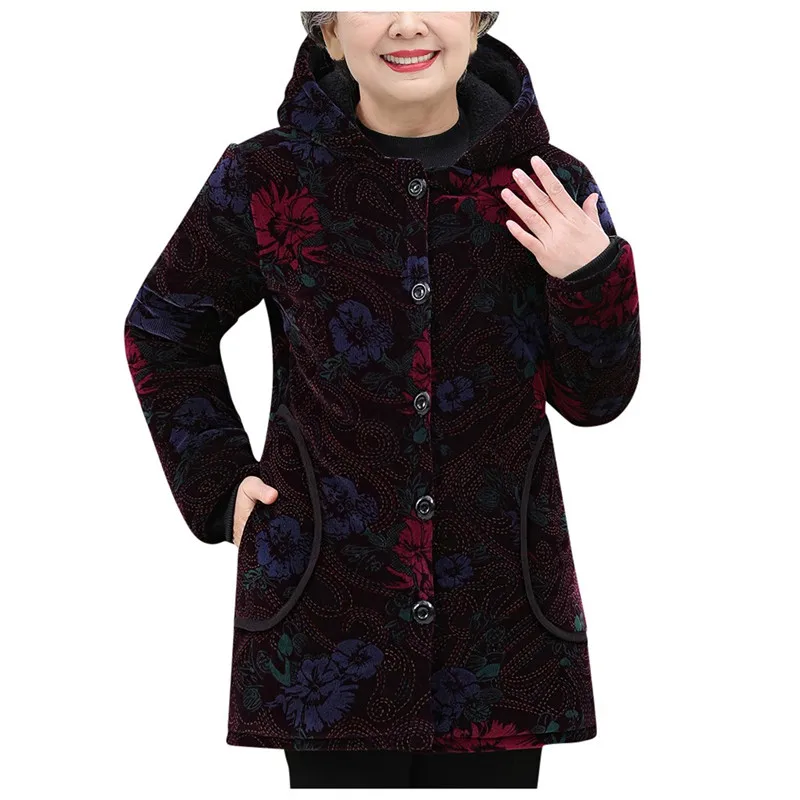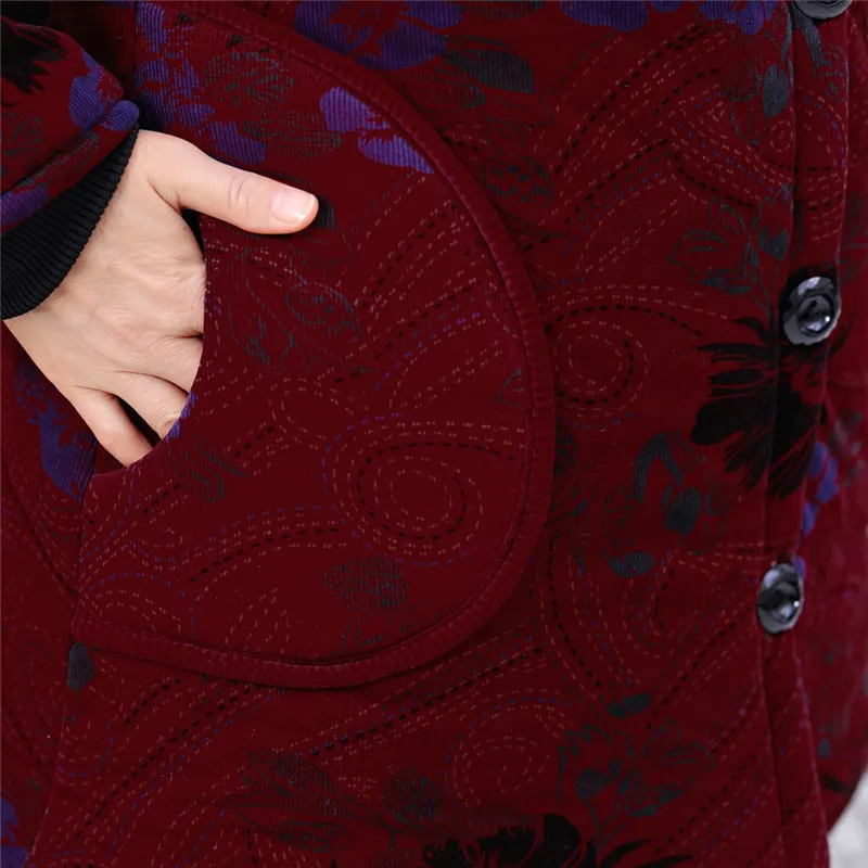 Elderly Women Special Button Printing Design Cozy Leisure Warmr Winter Long Coat