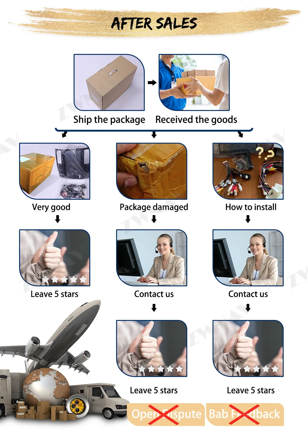 5. Покупатель должен проверить посылка, прежде чем расписаться и забрать посылка. (Если покупатель обнаружил, что посылка пуста, пожалуйста, не подписывайте и свяжитесь с нами.)
