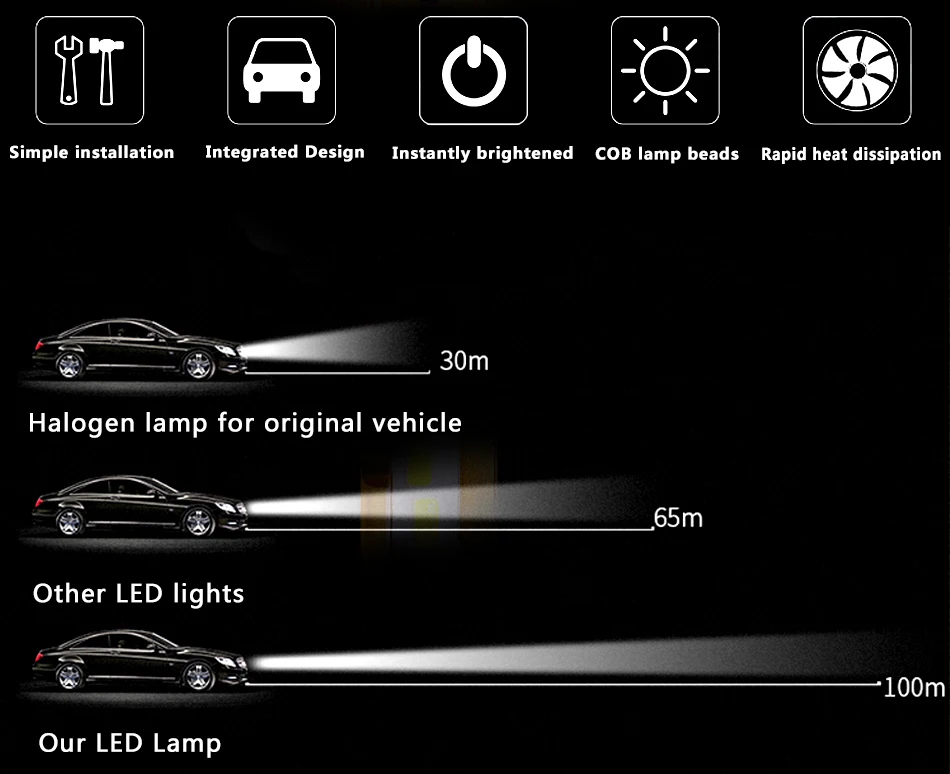 Напряжение: DC9 ~ 16 В Мощность: 60 Вт/пара, 30 Вт/лампа Светильник flux: 3500LM/Лампа, 7000LM/пара Тип чипа: эффективный DOB Материал: алюминиевый 6063 Цветовая температура: 6000K Уровень защиты: IP68 Стабильная работа: -40 ~ + 140 °C Дополнительная модель: H4 (Дальний и ближний свет) H1/H7/H8/H9/H11/9005/9006/9012 (однолучевой) Использование: Автомобильные фары (дальнего/ближнего света), Автомобильные противотуманные фары Преимущества и особенности: Корпус Лампы изготовлен из высококачественного авиационного алюминиевого материала для общего рассеивания тепла. Граница светового эффекта ясна, и нет постороннего или яркого света, что внесло большой вклад в безопасность водителя. Посылка включает: 2 шт. светодиодный лампы для фар
