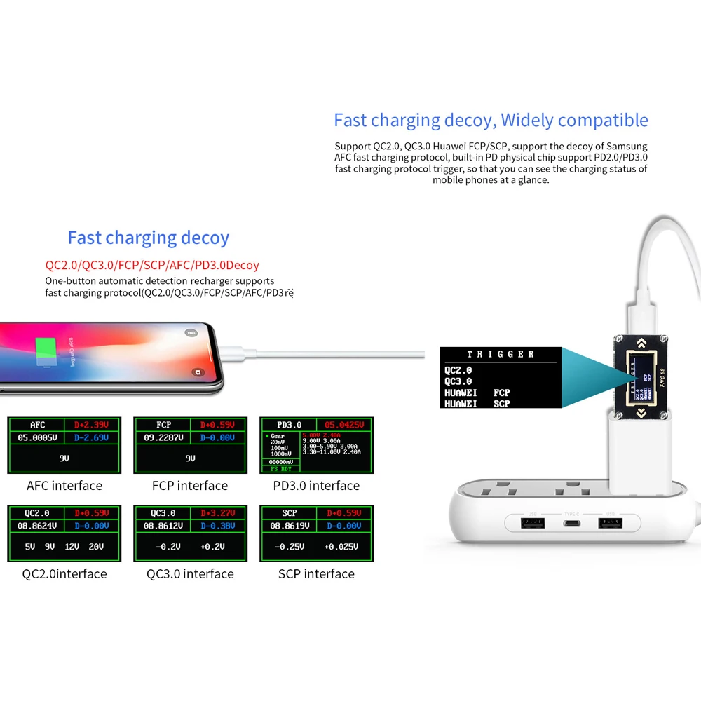 Быстрая зарядка, широко совместима. Автоматическое зарядное устройство с одной кнопкой поддерживает протокол быстрой зарядки (QC2.0/QC3.0/FCP/SCP/AFC/PD3.0).