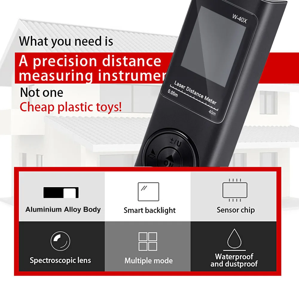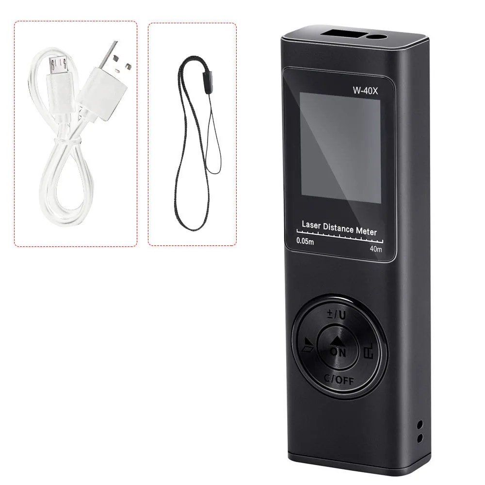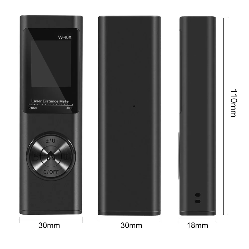 Этот портативный дальномер la-ser с размером ладони, широко используемый в интерьере, дизайне в помещении, строительной сфере. Он может точно измерять расстояние, площадь и объем, быстро и удобно с широким диапазоном 40 м и точностью до ± 2 мм.