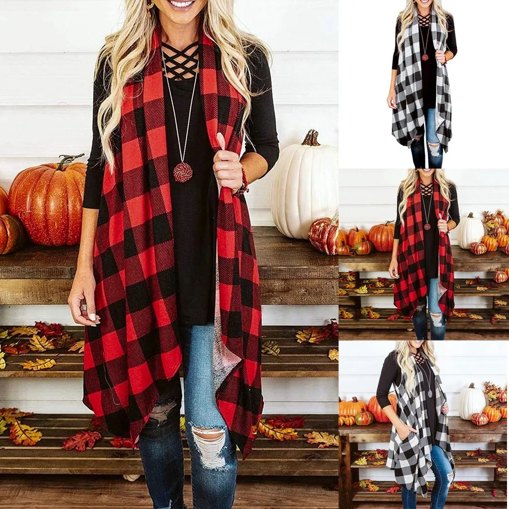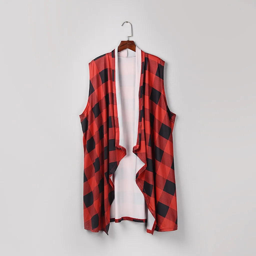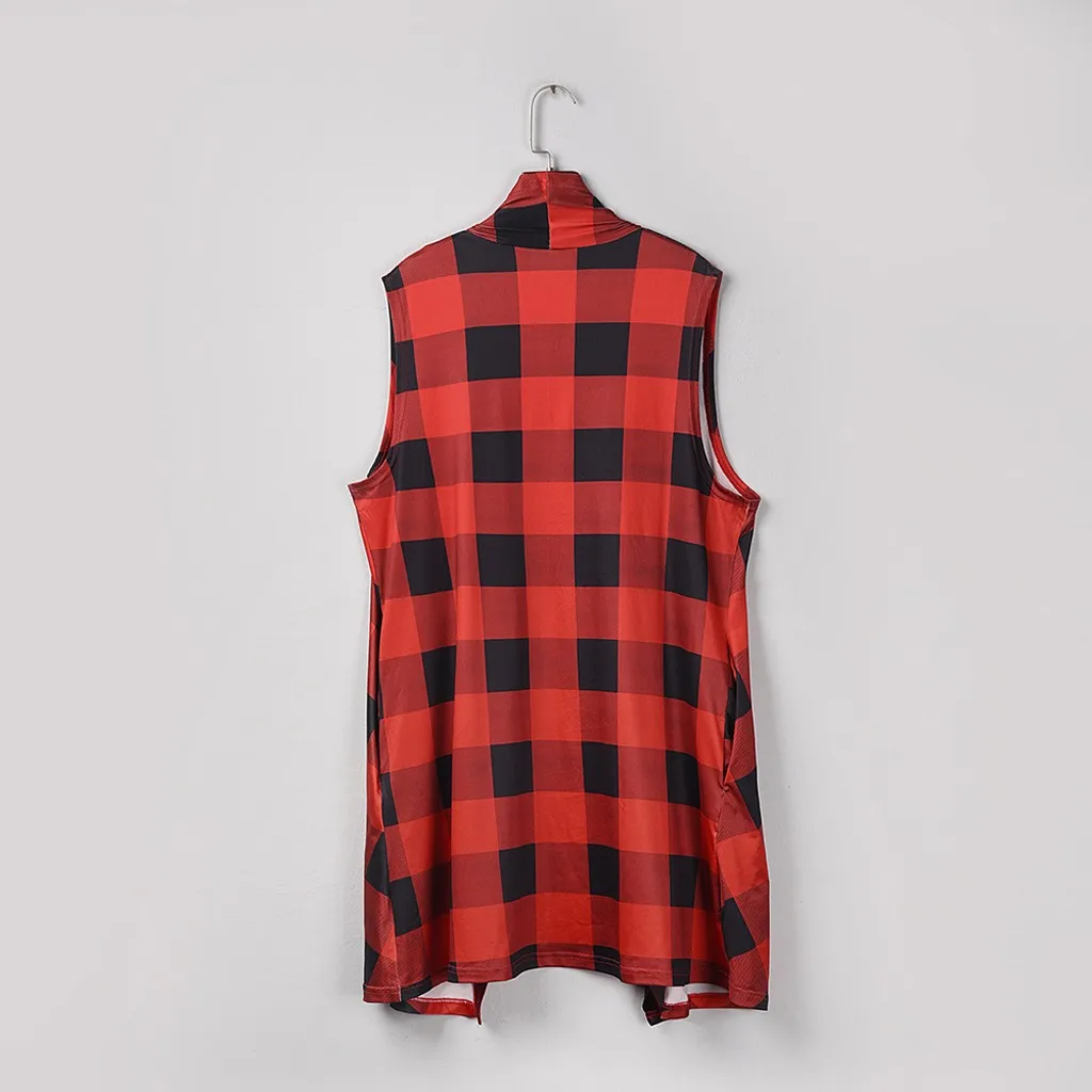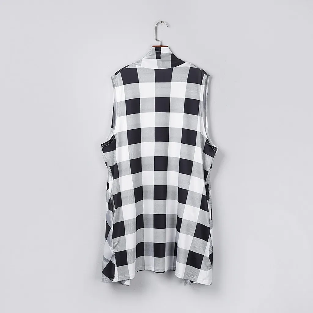Женский клетчатый открытый передний кардиган без рукавов с карманами и драпировкой, легкий жилет, пальто