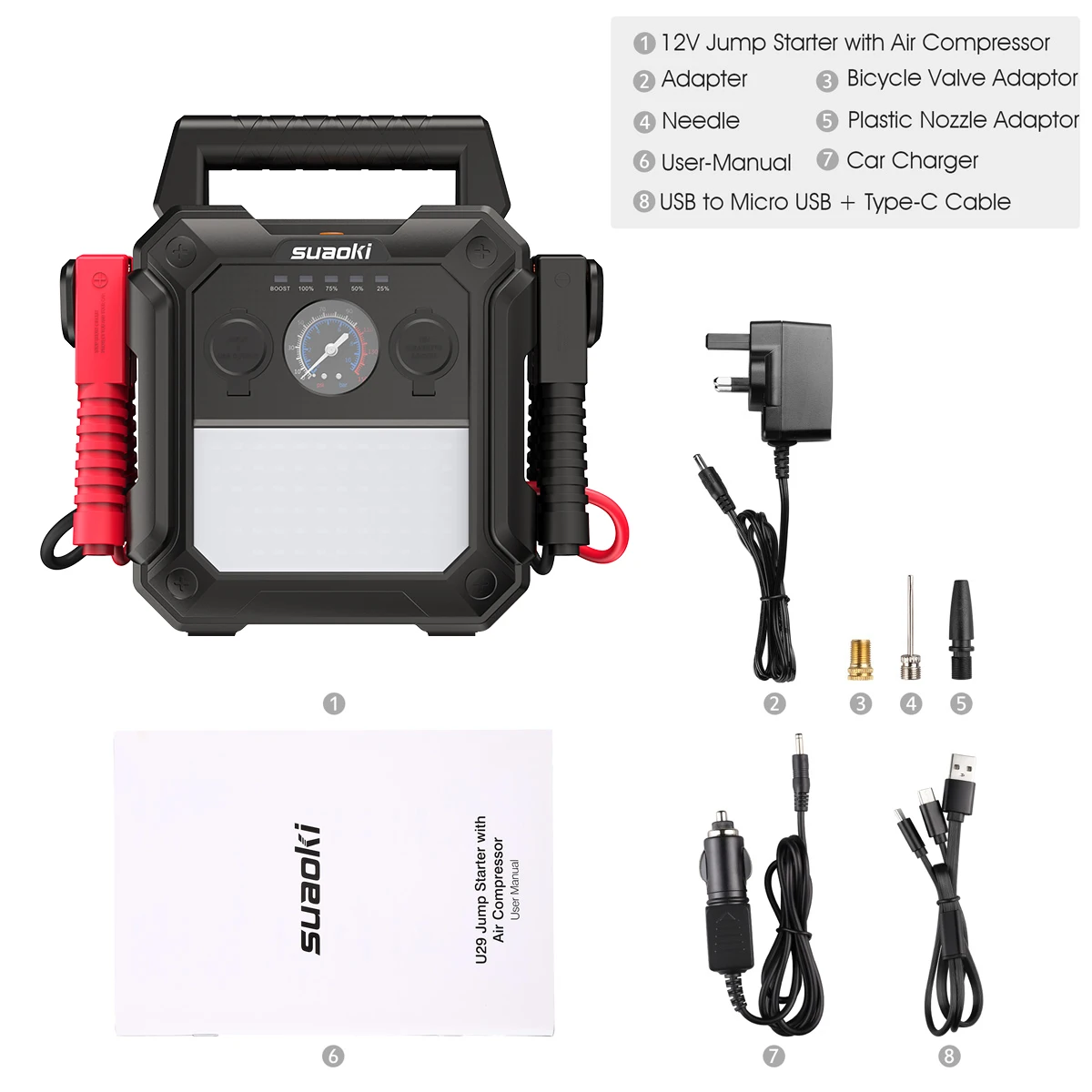 Suaoki U29 представляет собой 4-в-1 компактное устройство, которое сочетает в себе мощный стартер скачка, аккумуляторная батарея постоянного тока/питание через порт USB, 150 фунтов/кв. дюйм воздушный компрессор, и аварийный прожектор. Этот блок обеспечивает 2000 пиковые усилители практически для любого 12-вольтовой транспортных средств и даже лодки. Несмотря на свои огромные амперы, блок безопасен в использовании, потому что имеет встроенный механизм защиты и сверхмощные кабели усилителя.