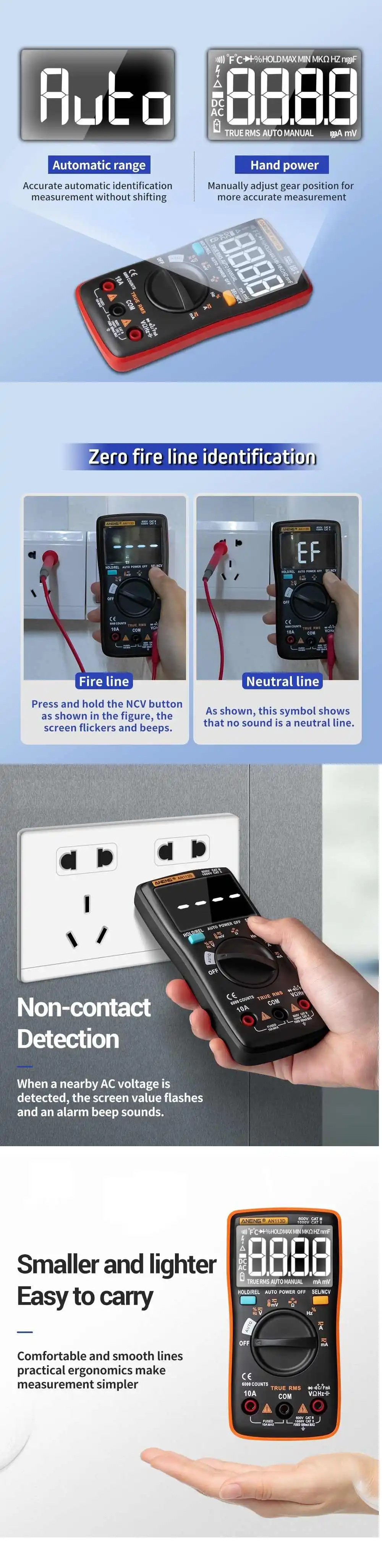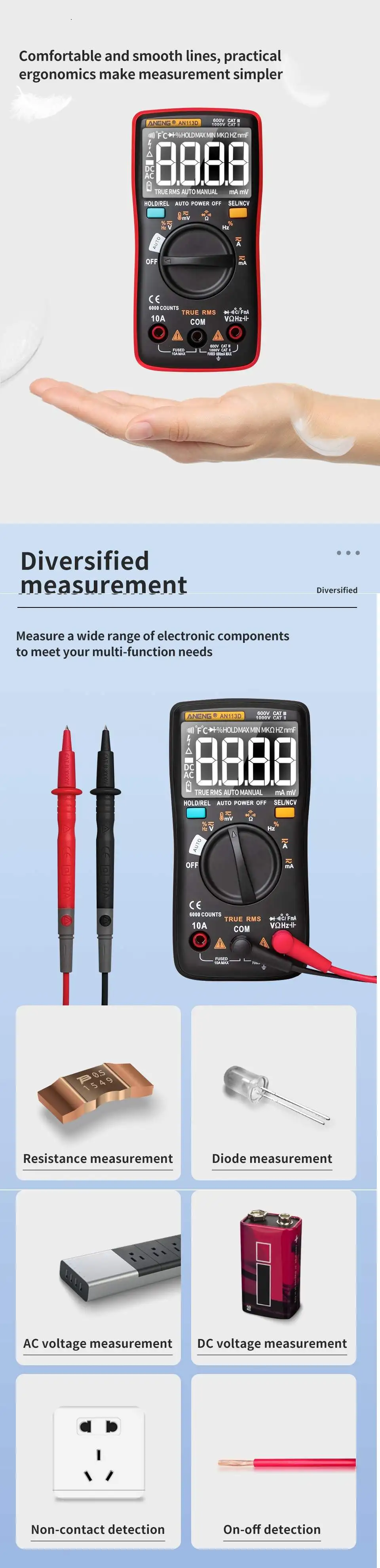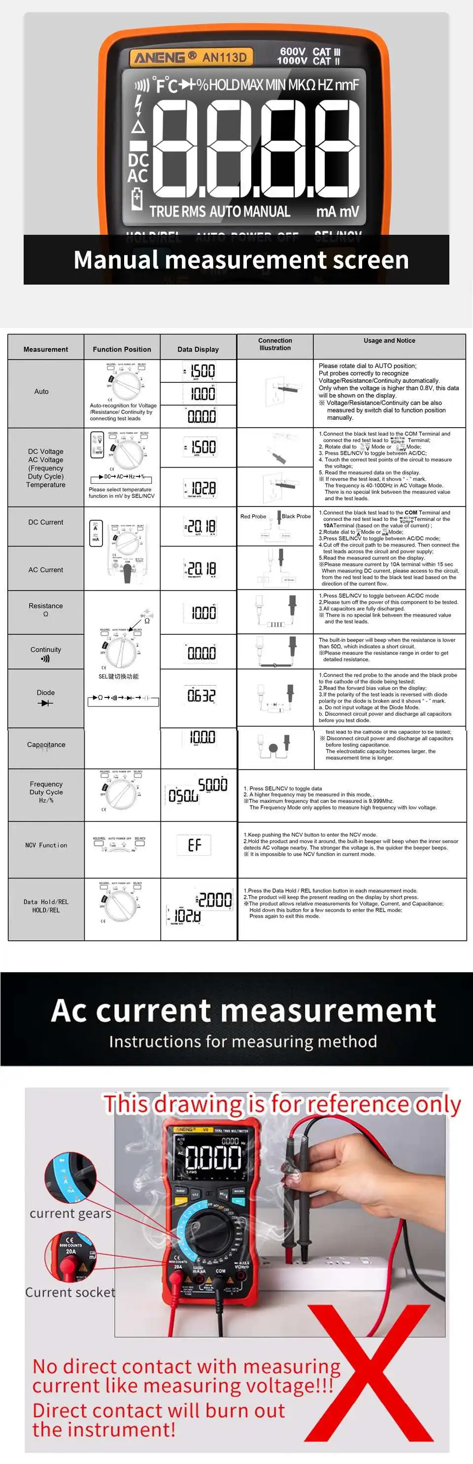 1. Функции измерения включают напряжение переменного/постоянного тока, ток переменного/постоянного тока, сопротивление, диодный тест/непрерывность, NCV, частоту/рабочий цикл, емкость.