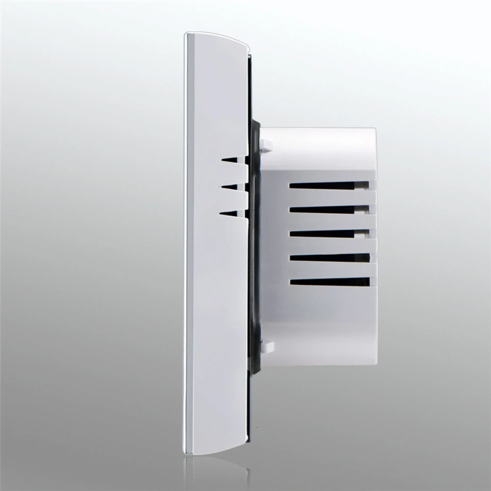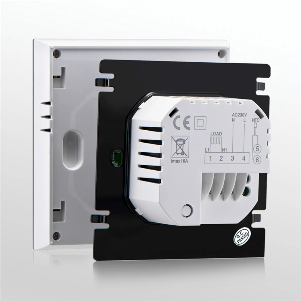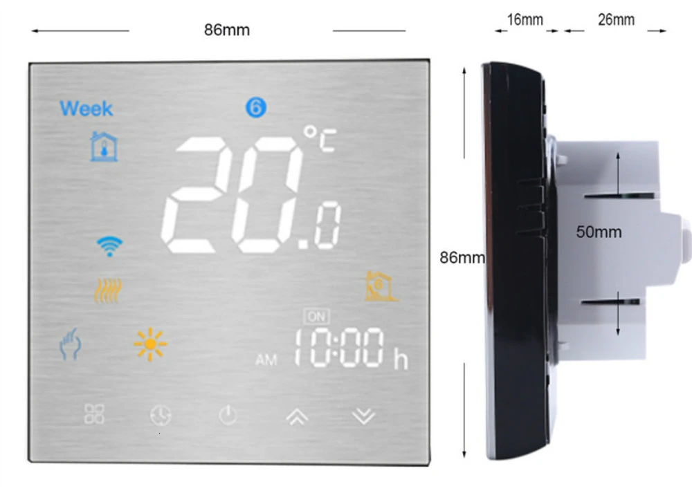 Умный термостат Технические характеристики изделия 1. Питание: 95-240 В пер. тока, 50/60 Гц 2. Текущая нагрузка: 16А (электрическое отопление), 5А (водонагревание/водонагреватель/газовый котел) 3. Датчик: NTC 4. Точность: ± 0,5 ℃ 5. Диапазон температуры дисплея: 5-35 ℃ 6. Температура окружающей среды: 0-45 ℃ 7. Влажность окружающей среды 5-95% RH (без конденсации) 8. Температура хранения: -5-45 ℃ 9. Мощность Потребляемая мощность: <1,5 W 10. Ошибка синхронизации: <1% 11. Материал корпуса: поликарбонат + АБС (огнестойкий) 12. Класс защиты: IP20