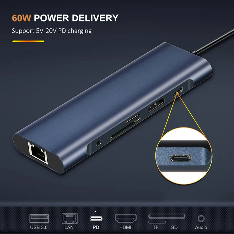 -Название: 9 в 1 концентратор USB Type C выход: USB 3,0*3, HDMI * 1, VGA * 1, SD/TF кардридер * 1, PD порт * 1