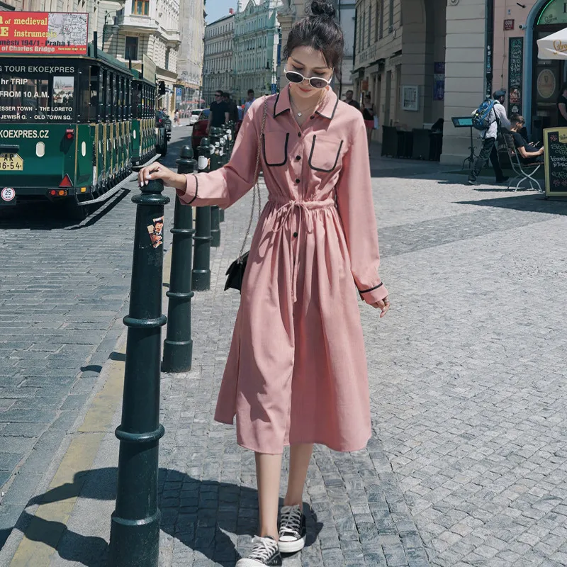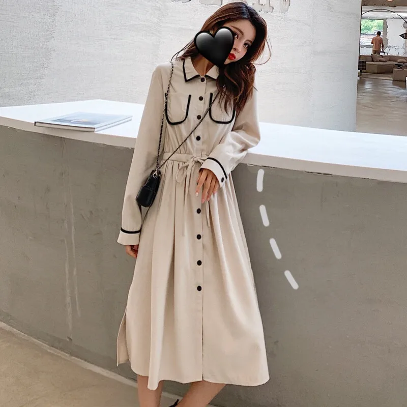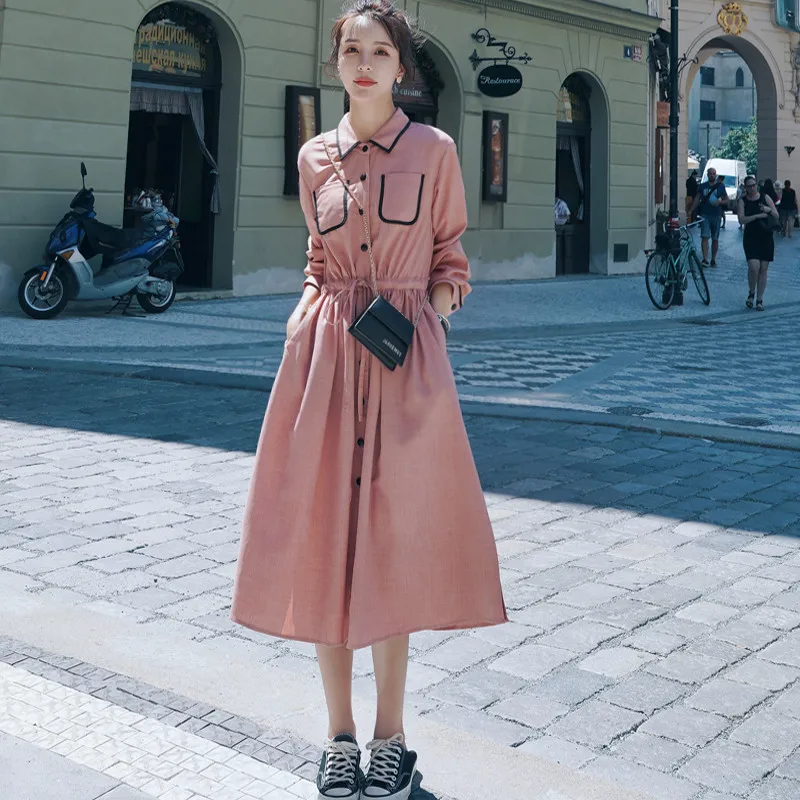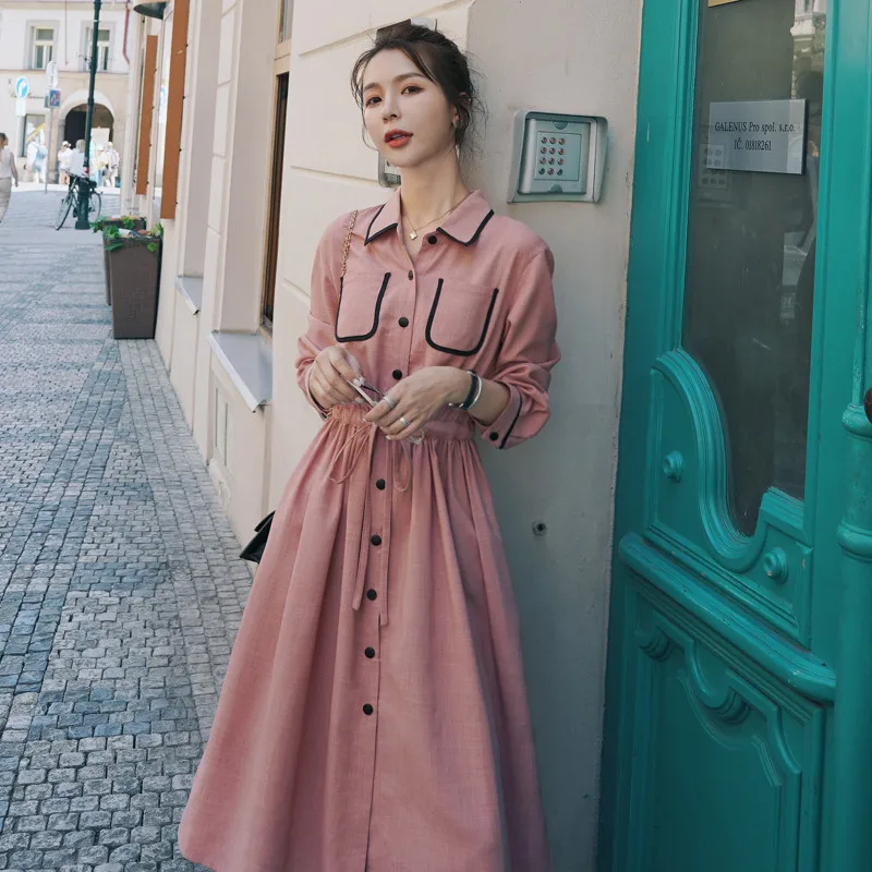 Винтажное длинное платье-рубашка однобортное платье с длинными рукавами