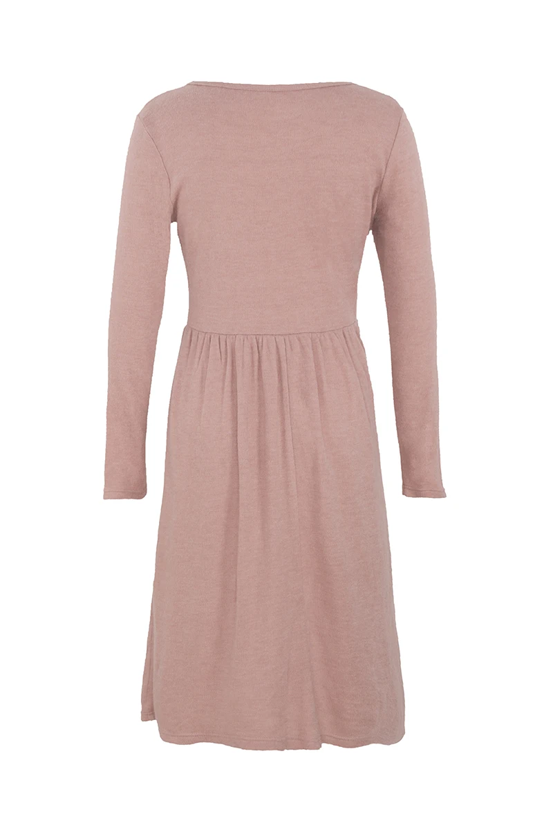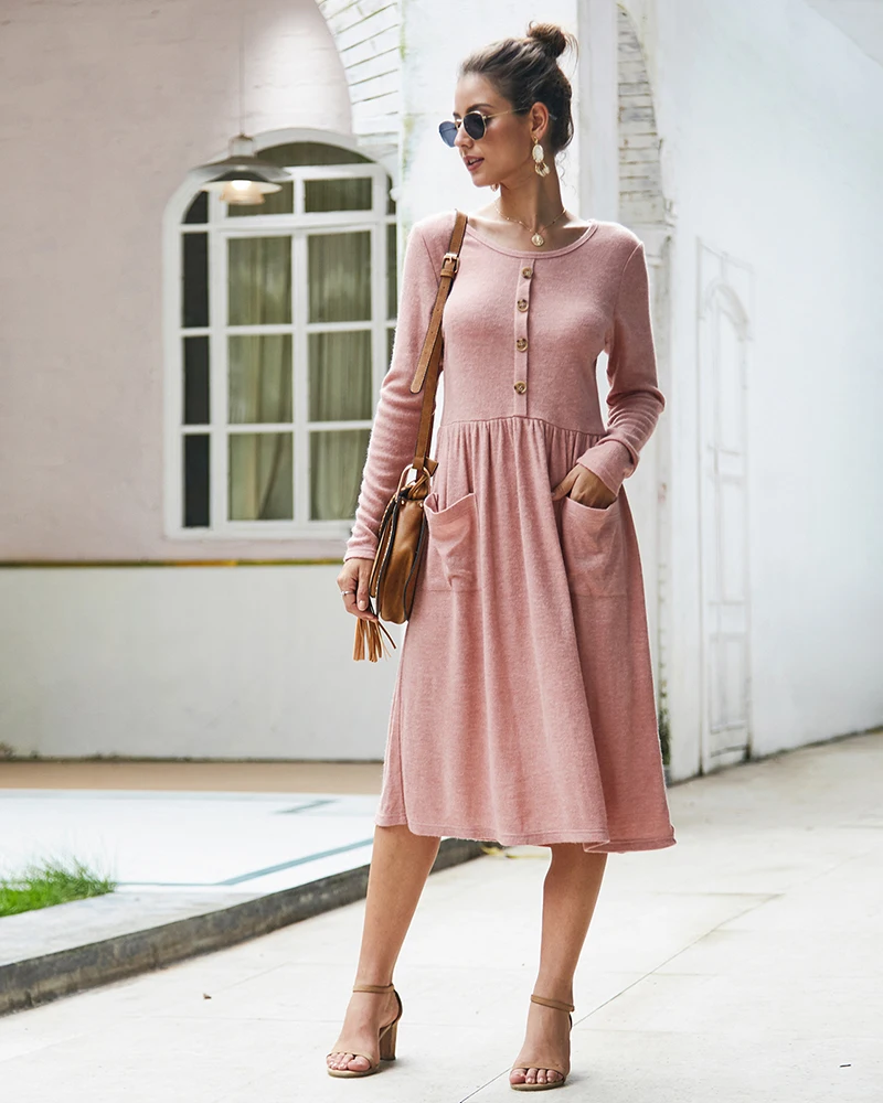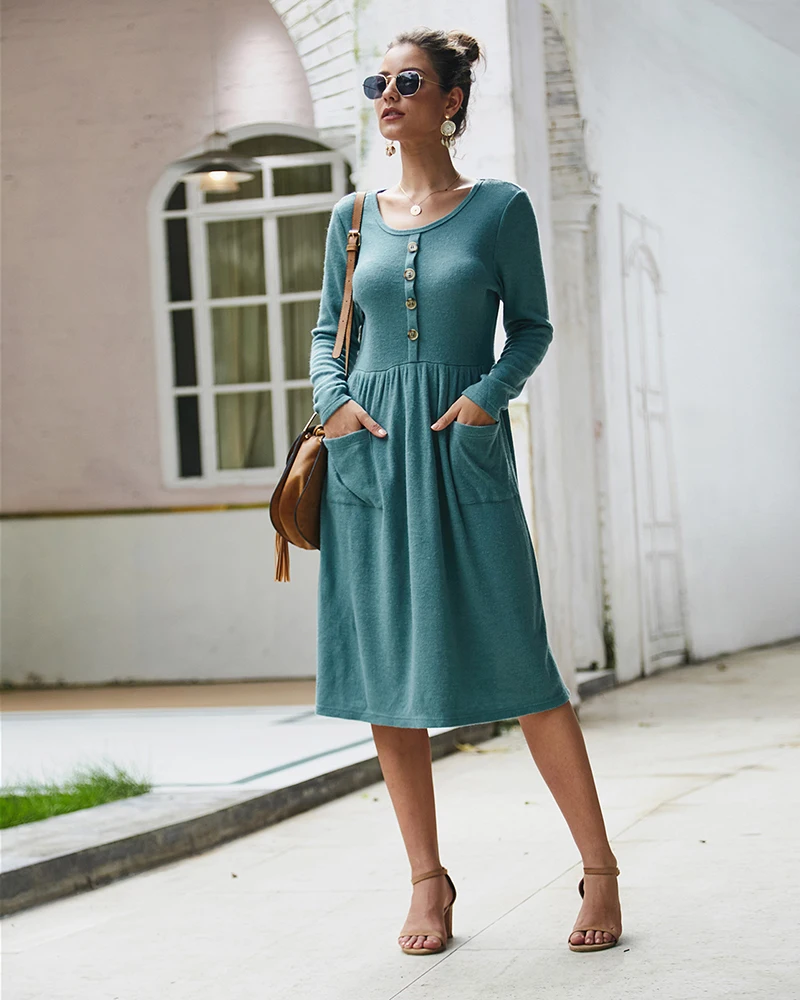 Осеннее Повседневное платье Aswinfon, 2019, с карманами, круглым вырезом, длинными рукавами, Чистый Розовый, чистый зеленый, Платье Ампир. Если вы наденете это платье, вам станет красиво и комфортно.