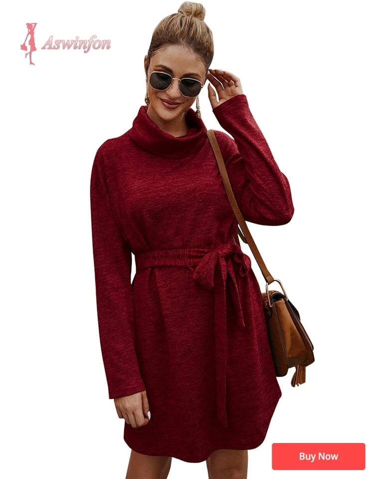 Женское трикотажное платье-свитер Aswinfon, однотонное платье миди с длинными рукавами и поясом, цвет желтый, черный, Осень-зима 2019