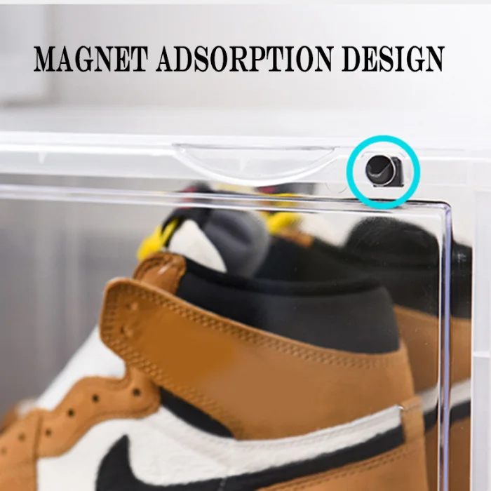 Четкий дисплей:Материал-ультра-прозрачный акрил + ПП + магнитная дверь. Прозрачная задняя сторона и Легко открывающаяся дверь показывают панораму ваших классных кроссовок, и вы можете легко найти нужную обувь, не открывая все коробки.