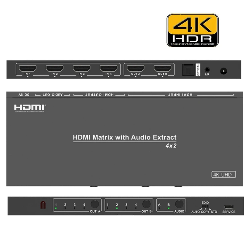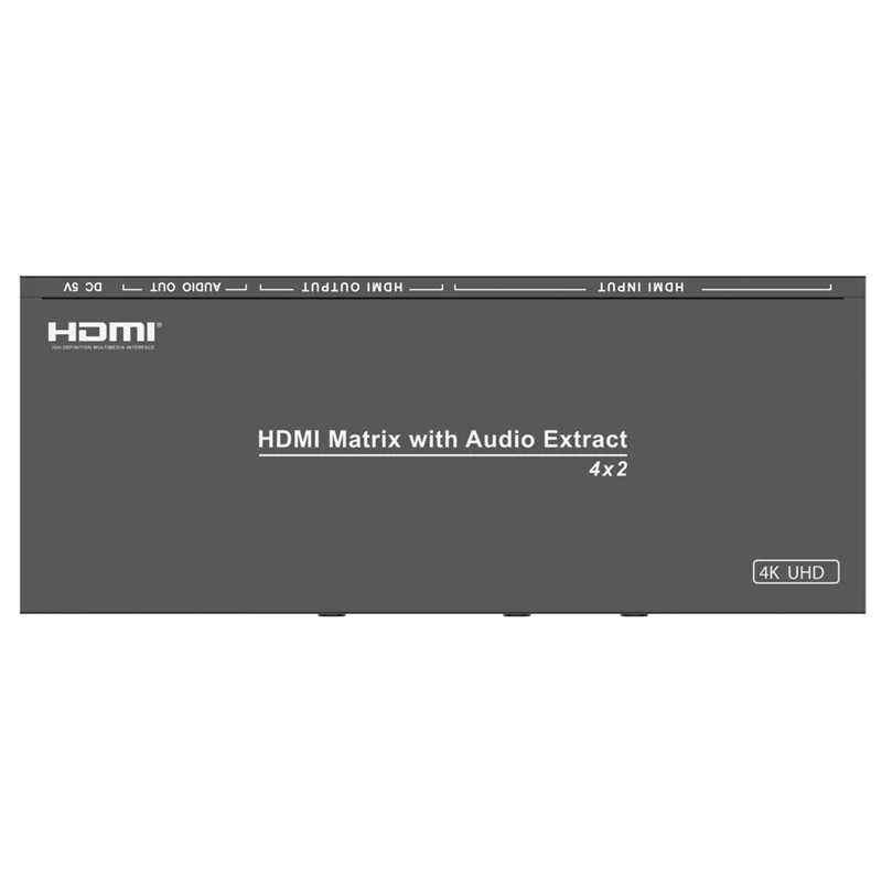 4x2 HDMI матрица одновременно четыре канала HDMI источников на два HDMI дисплея. Он поддерживает разрешение до 4K2K @ 50/60Hz YCbCr 4:2:0 и HDCP 2,2. Этот продукт поддерживает извлечение звука из выхода А или выхода в порт