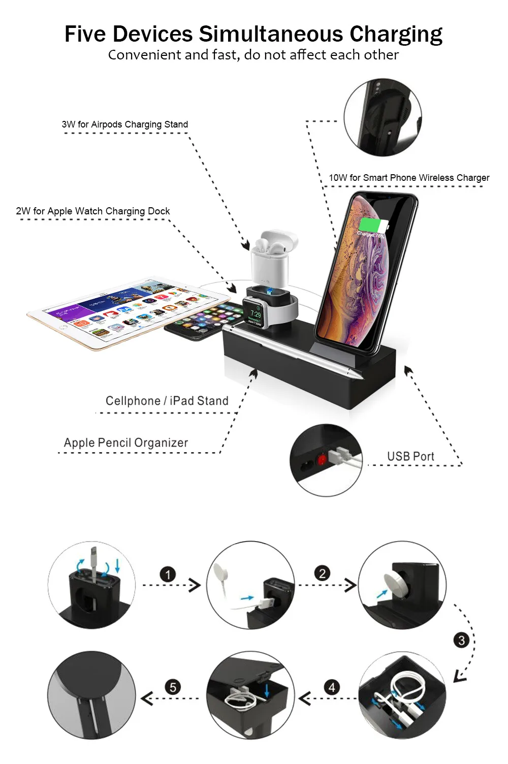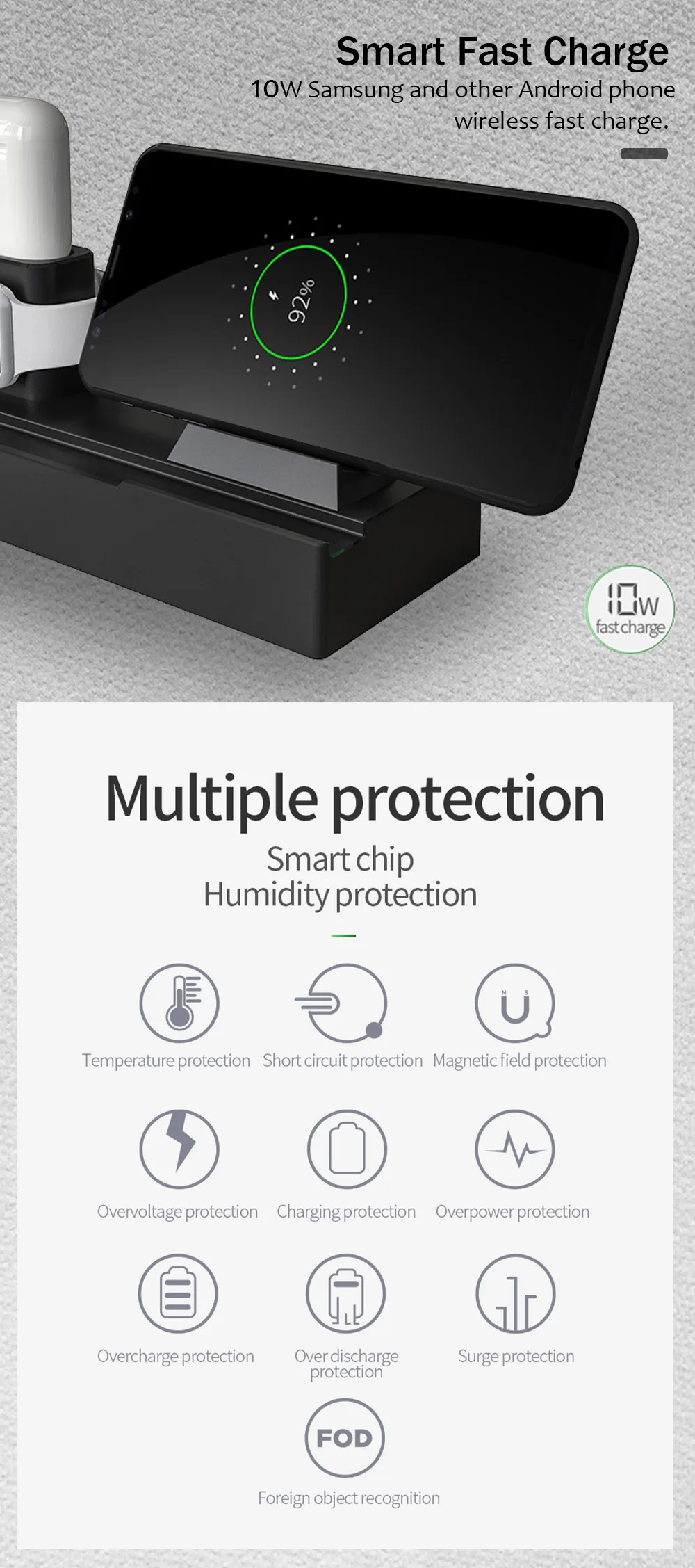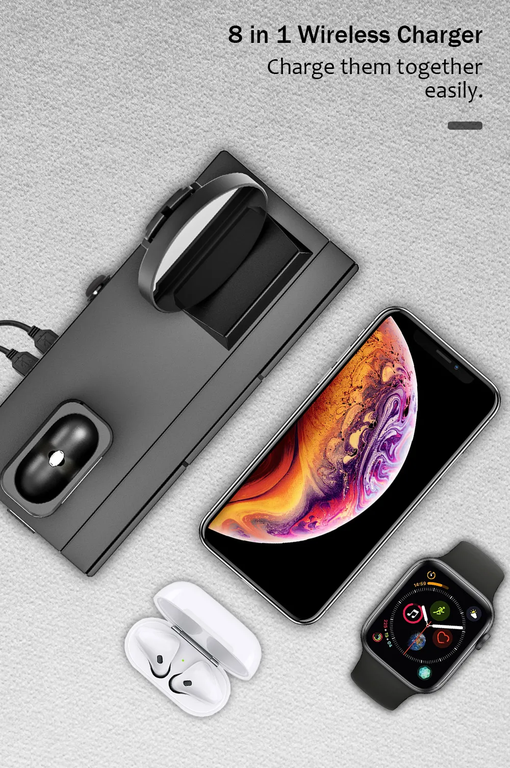 Технические характеристики: 1. Цвет: черный. 2. Мощность: 10 Вт/7,5 Вт/5 Вт автоматическая идентификация 3. Материал: АБС + ПК 4. Расстояние срабатывания: 0-8 мм Упаковочный лист: 1*8 в 1 беспроводная зарядная станция 1 * Руководство пользователя 1 * кабель для зарядки наушников