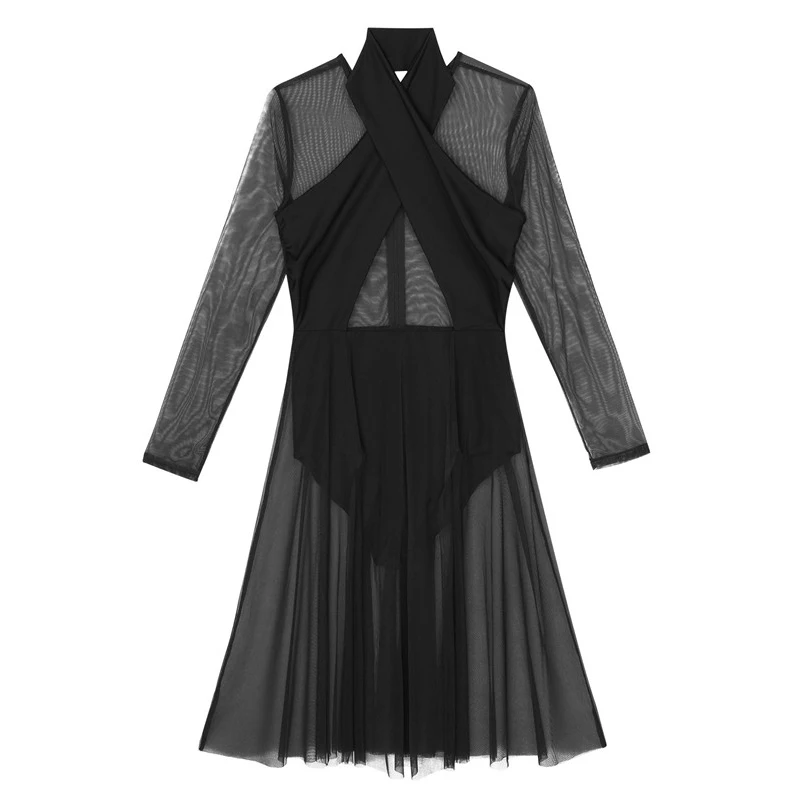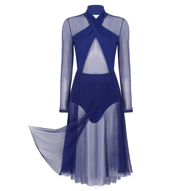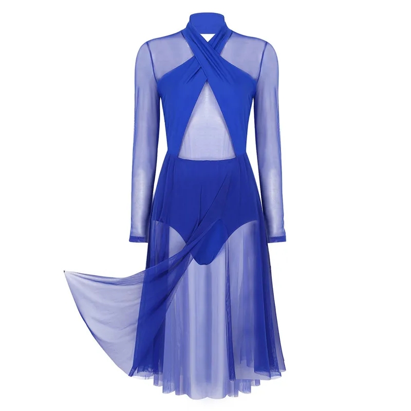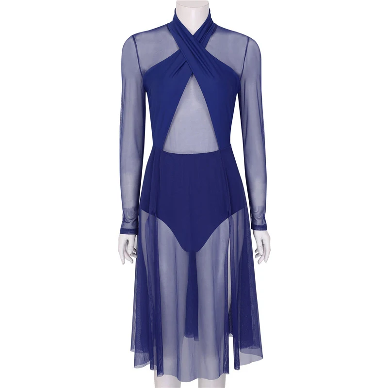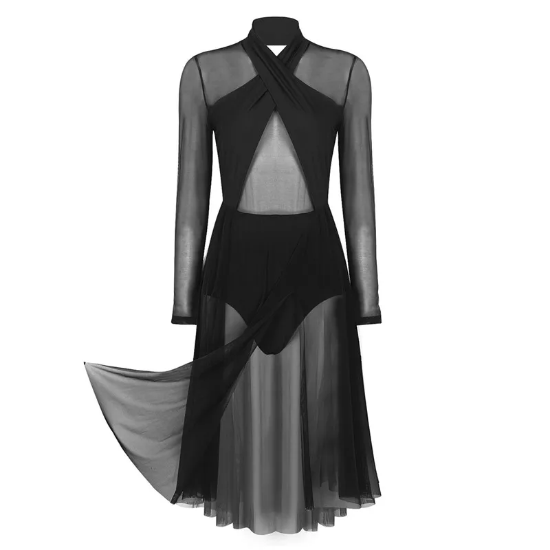 Женское взрослое лирическое танцевальное трико, платье с бретелькой через шею и длинными рукавами, прозрачный сетчатый топ, лиф, современное классическое танцевальное платье