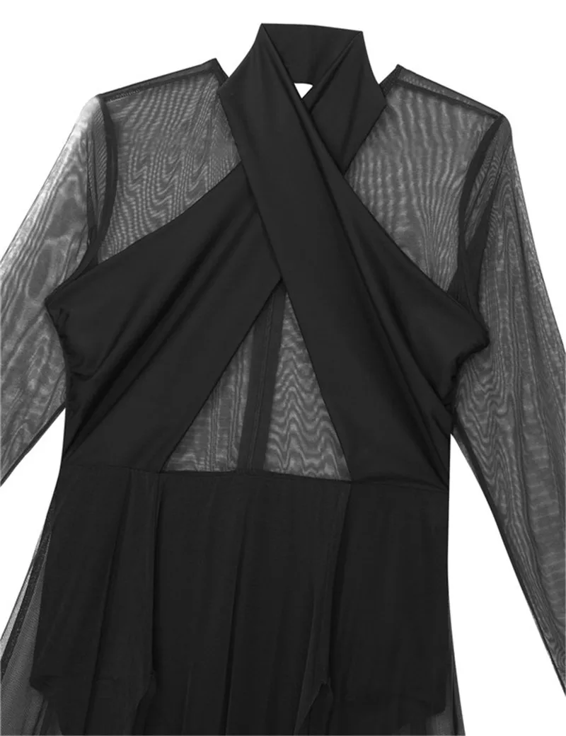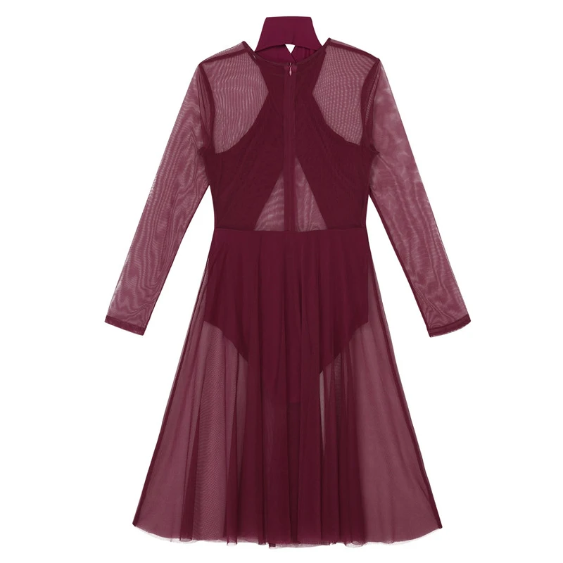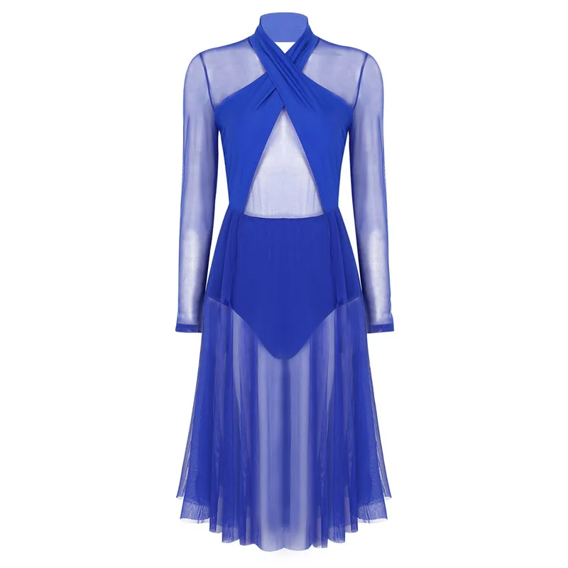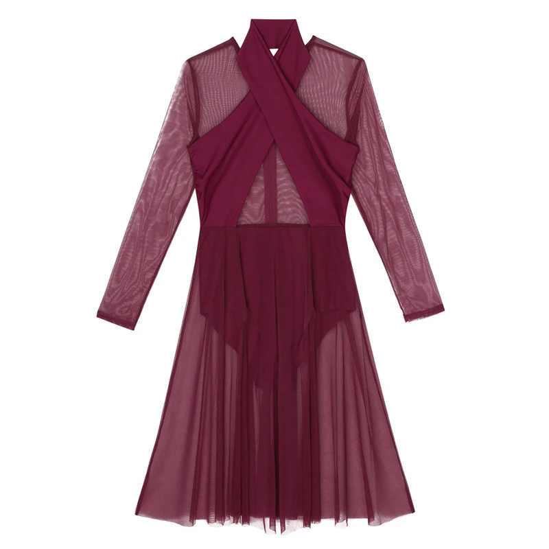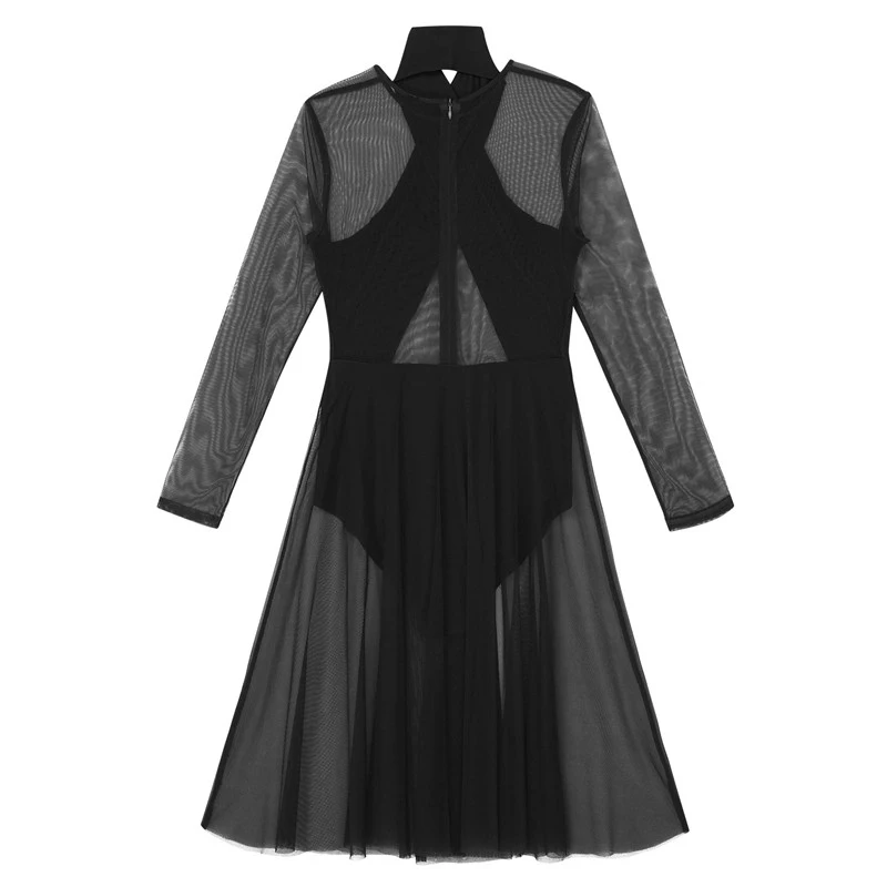 Женское взрослое лирическое танцевальное трико, платье с бретелькой через шею и длинными рукавами, прозрачный сетчатый топ, лиф, современное классическое танцевальное платье